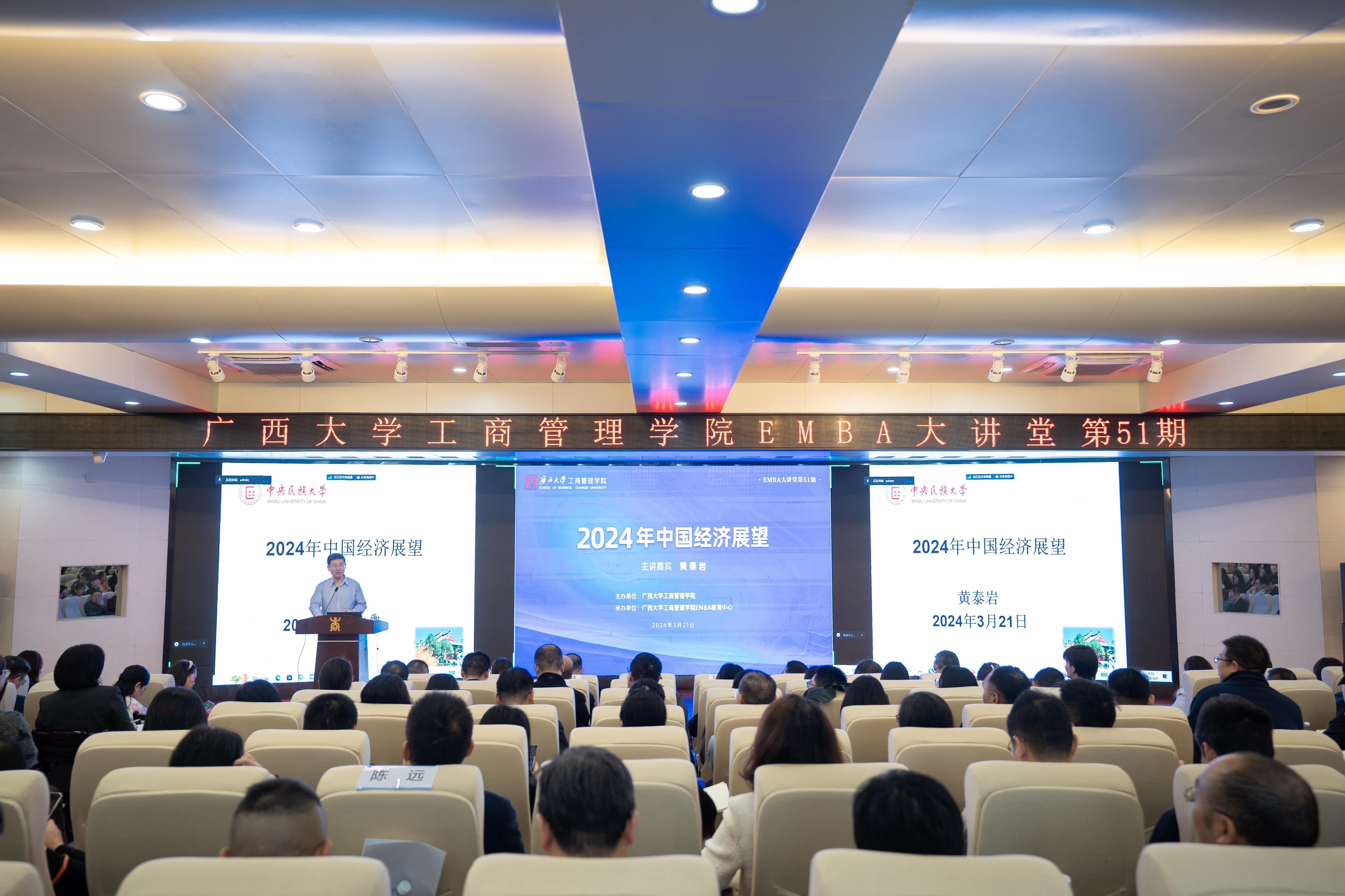 第51期“EMBA大讲堂”,以“2024年中国经济展望”为题为师生们作专题讲座。学院EMBA教育中心老师及200余名EMBA、MBA、SMBA校友到场学习。讲座开始前,校党委常委、副校长于文进在130会议室与黄泰岩教授亲切交流。