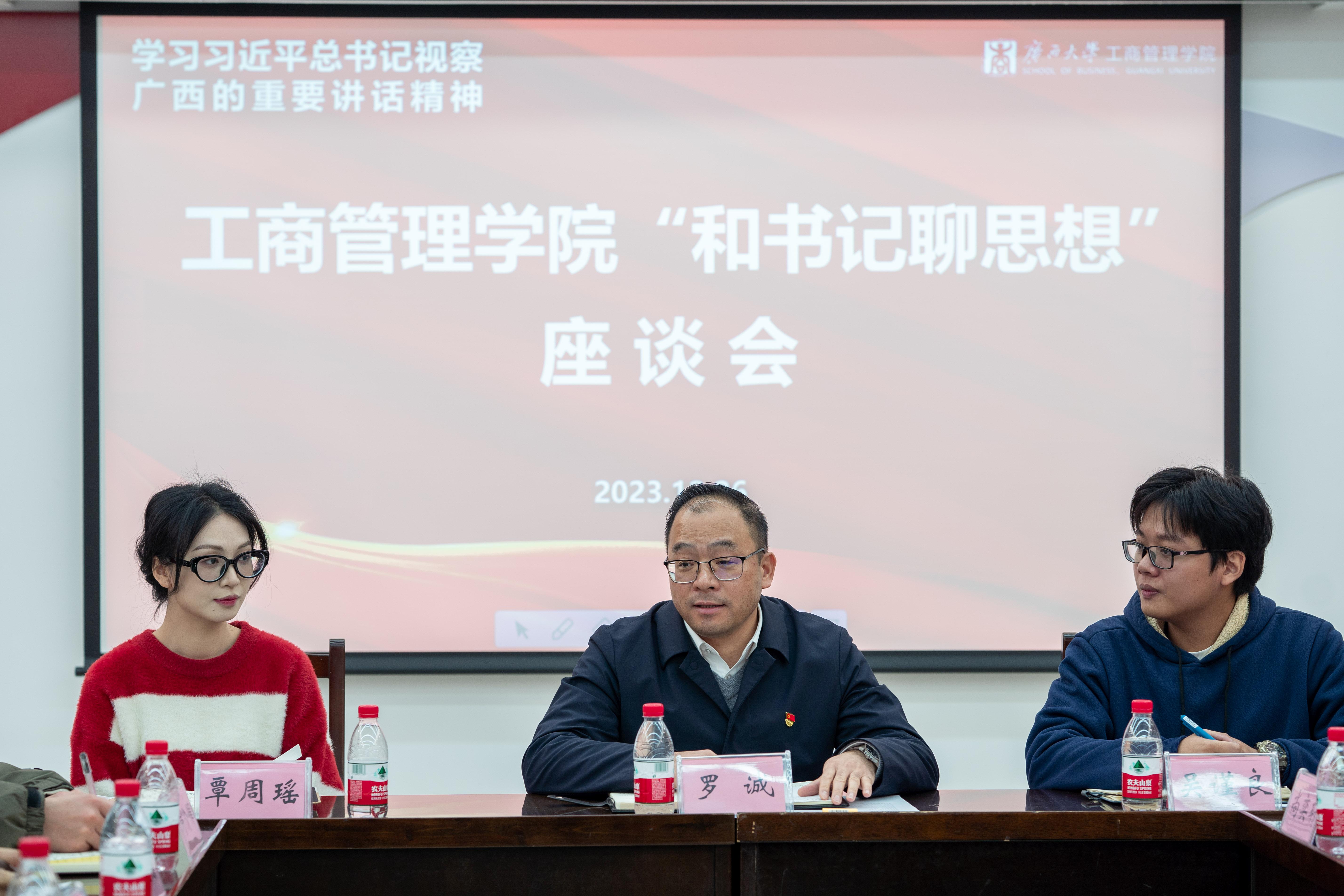 在党员活动室开展“和书记聊思想”活动,深入学习领会习近平总书记视察广西的重要讲话精神。学院党委书记罗诚与13名学生干部代表面对面交流,了解同学们的理论学习感悟、思想动态、日常学习生活等方面情况。学院党委副书记肖克宁、团委书记马丽娟、组织员黄照温、辅导员郁文丹参与活动。
