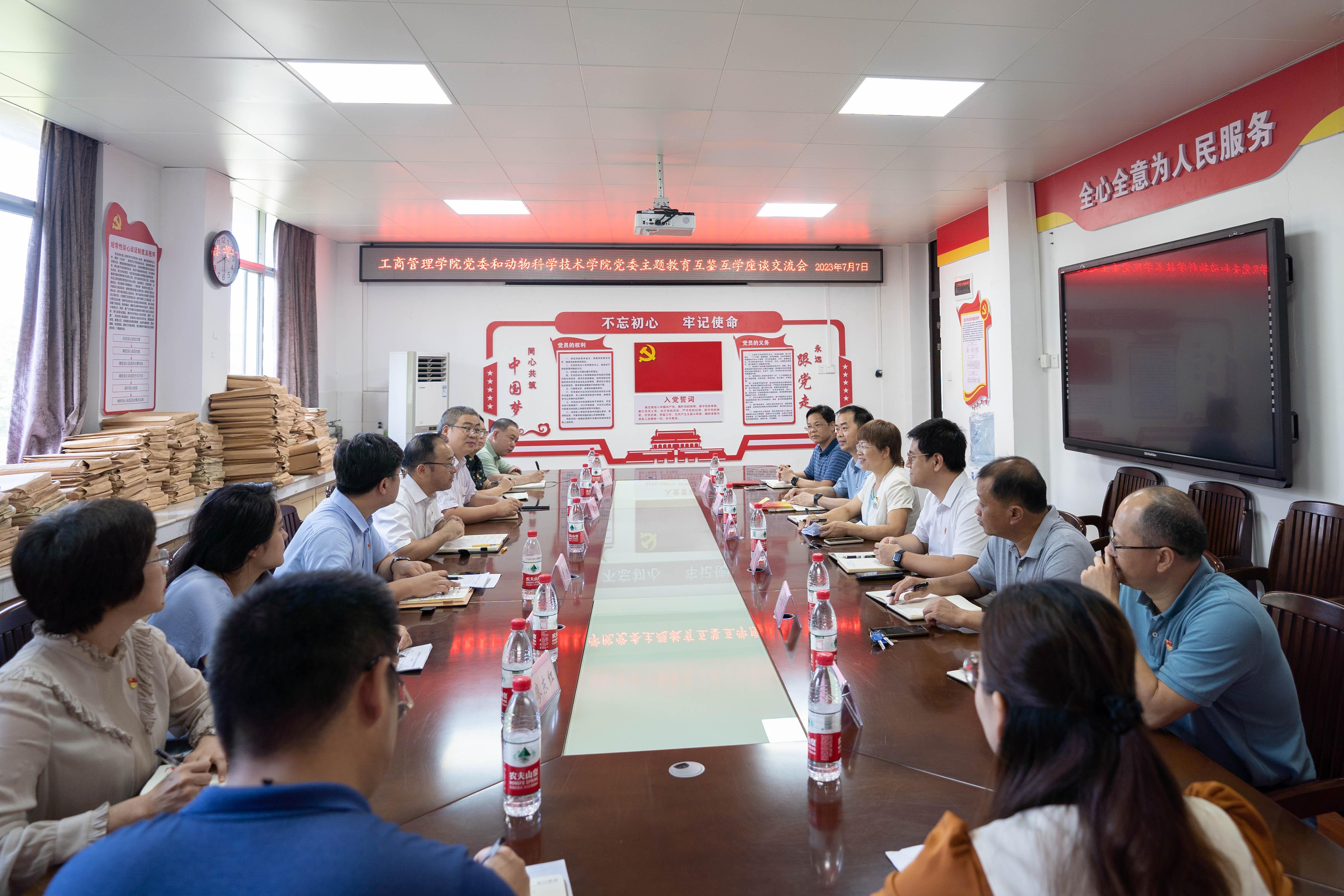 党委与动物科学技术学院党委在动物科学技术学院302会议室举行主题教育互鉴互学座谈交流会。统战部閤明勇副部长,督导组成员田春、刘小燕到会指导。