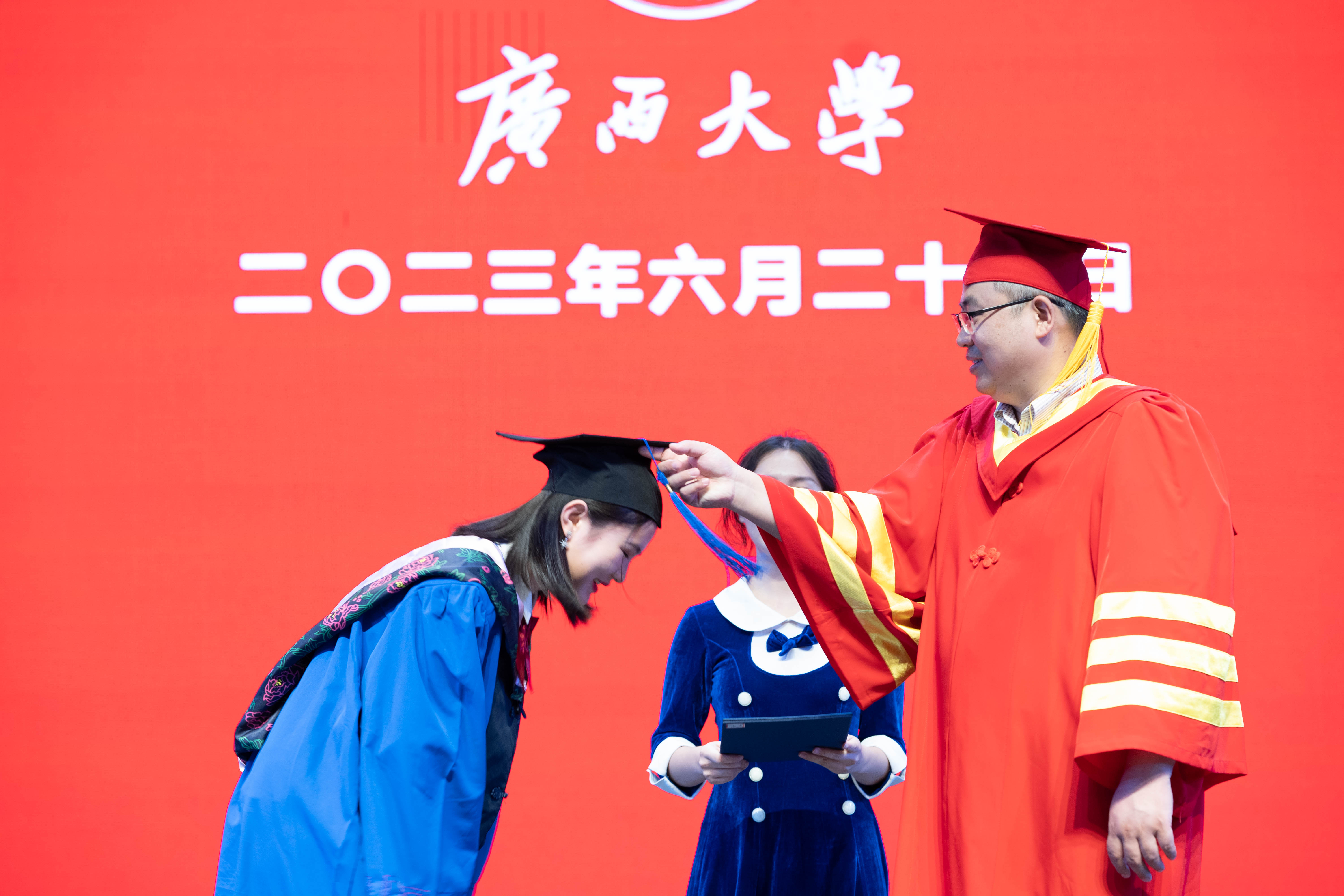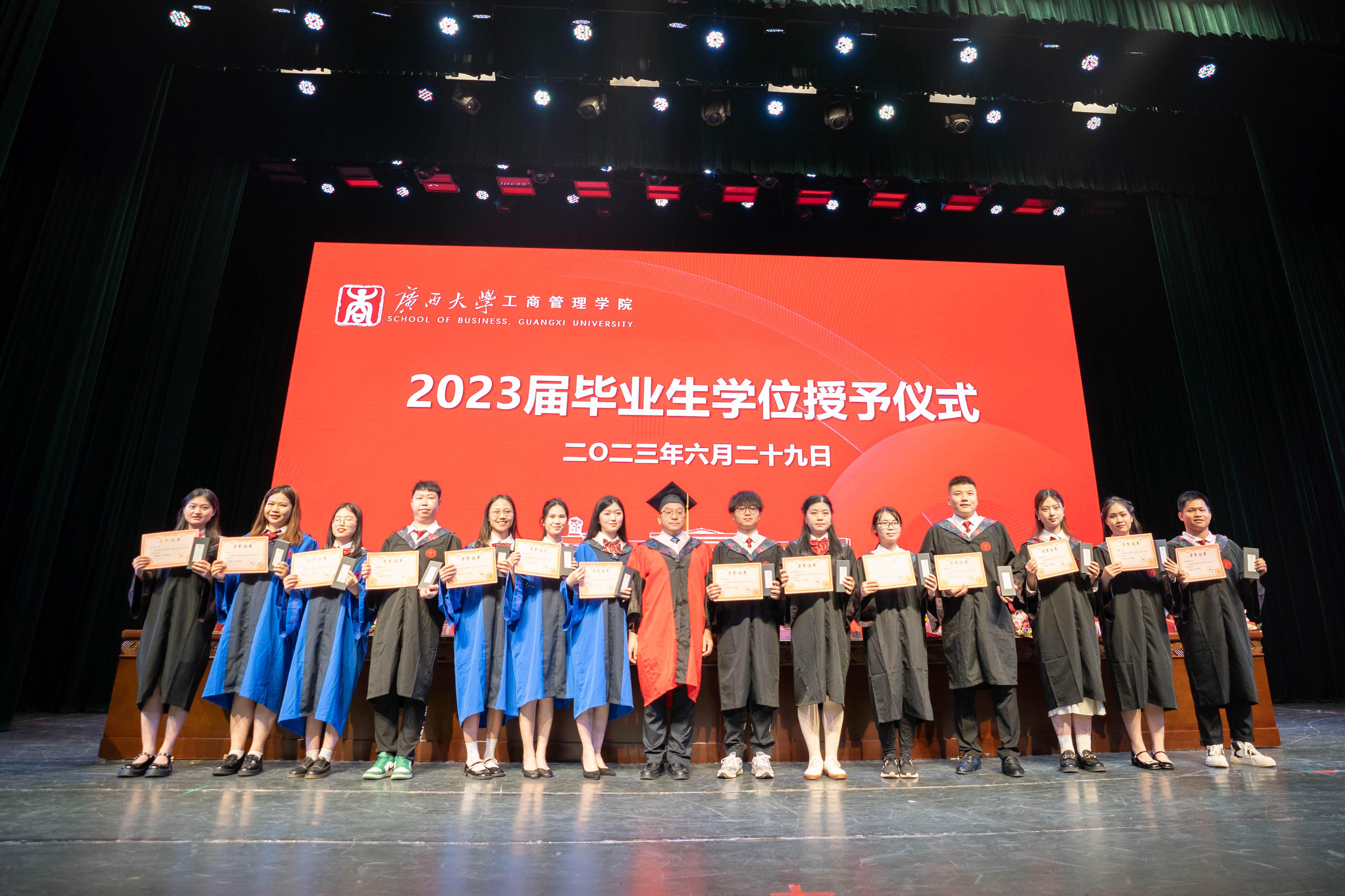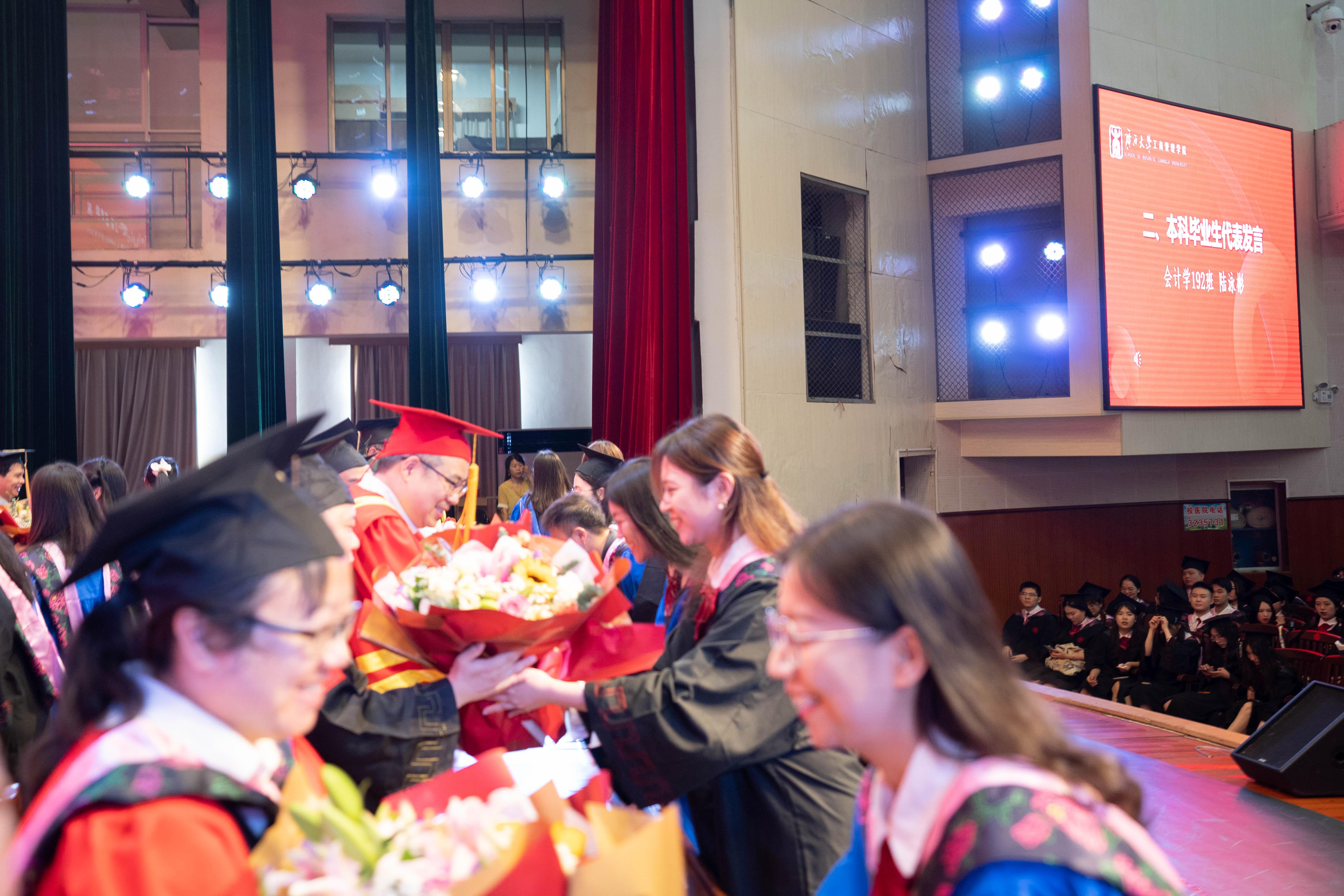 在雄壮激昂的国歌奏唱中,本届毕业典礼暨学位授予仪式拉开帷幕。学院党委书记罗诚为获得广西普通高等教育优秀毕业生、黑料网