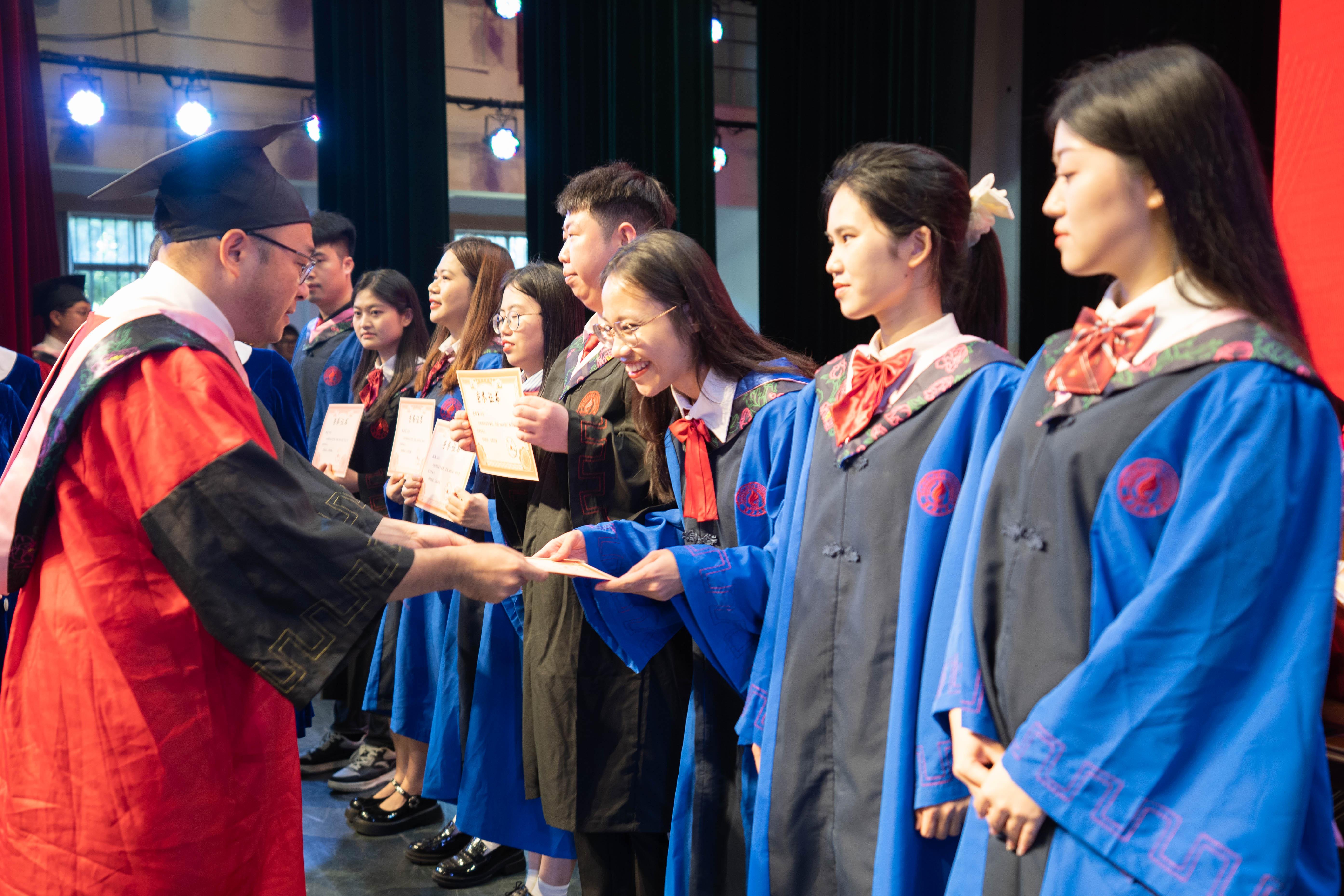 毕业生依次走上主席台接受授位。朱帮助院长为每一位毕业生颁授证书、拨穗正冠,各系教师代表与毕业生握手。