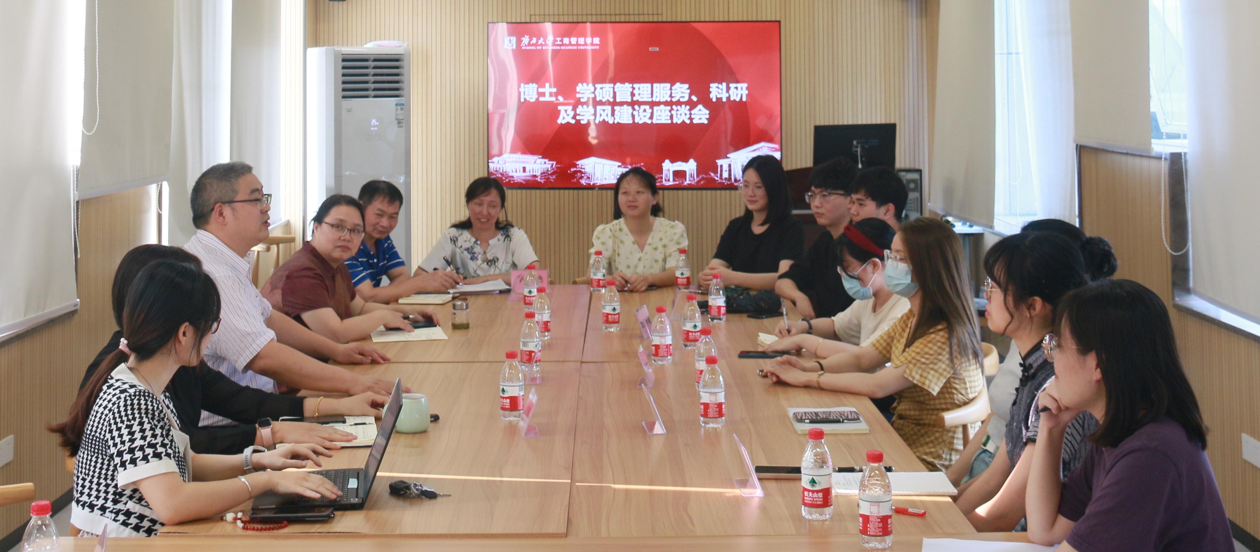 院长朱帮助出席座谈会并作讲话,研究生管理中心副主任暨MBA教育中心主任叶映、研究生管理中心全体教师以及各年级的博士研究生、学术型硕士研究生和专业型硕士研究生等25名学生代表参加交流座谈,座谈会由副院长朱少英主持。