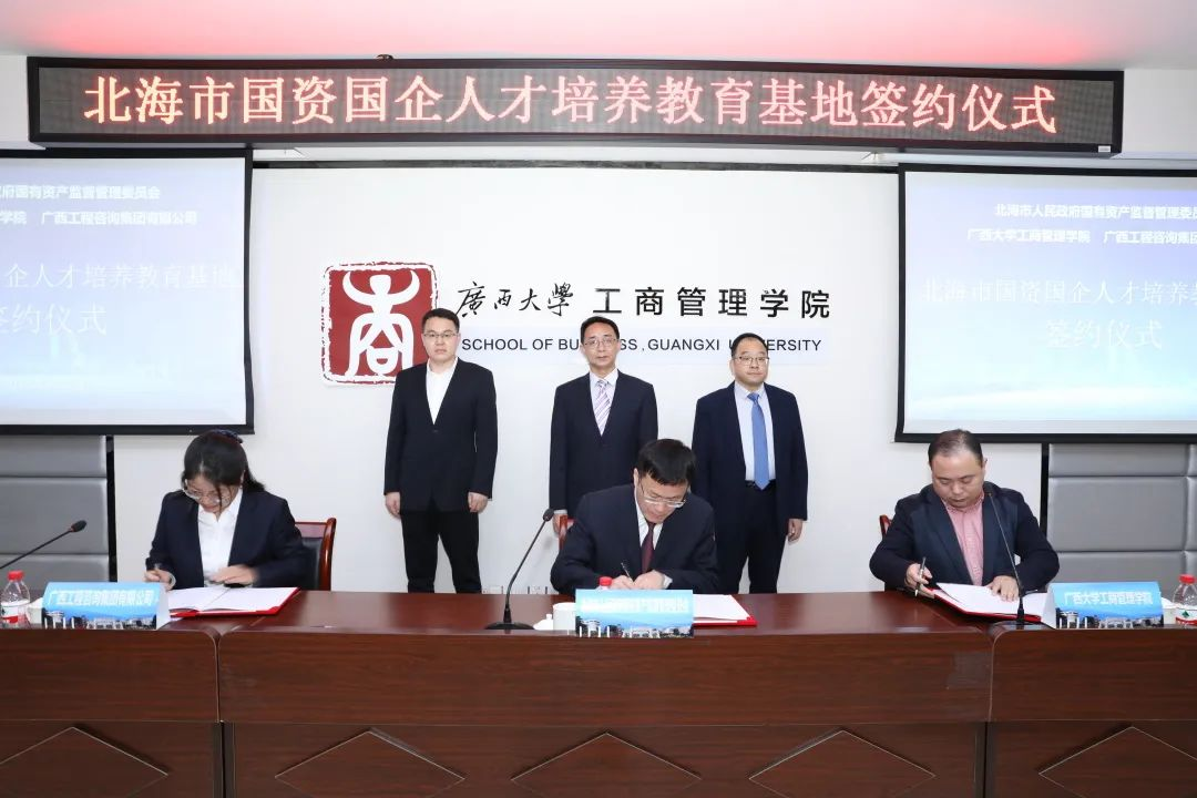 副院长刘民坤,广西工程咨询集团有限公司党委副书记左俊兰作为签约代表签署《北海市国资国企人才培养教育基地共建合作框架协议书》。