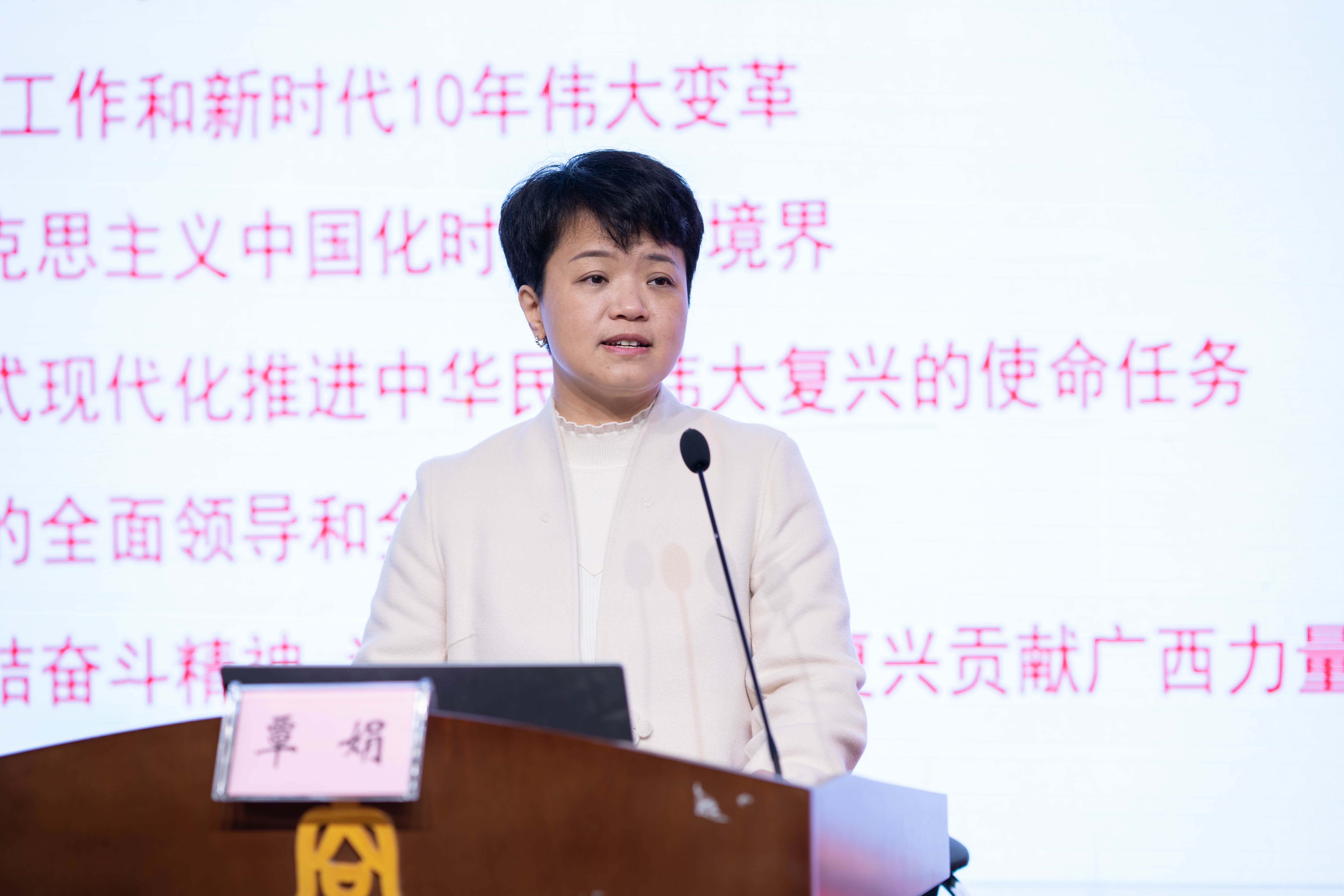 报告会上,覃娟紧扣党的二十大报告原文,结合广西发展实际,从“新征程、新思想、新篇章”三大角度,围绕党的二十大主题和主要成果,过去5年工作和新时代10年伟大变革,开辟马克思主义中国化时代化新境界,以中国式现代化全面推进中华民族伟大复兴的使命,坚持党的全面领导和全面从严治党,弘扬团结奋斗精神、为中华民族伟大复兴贡献广西力量等六个方面,紧密联系思想和工作实际对党的二十大精神进行了全面、深入、系统的解读。
