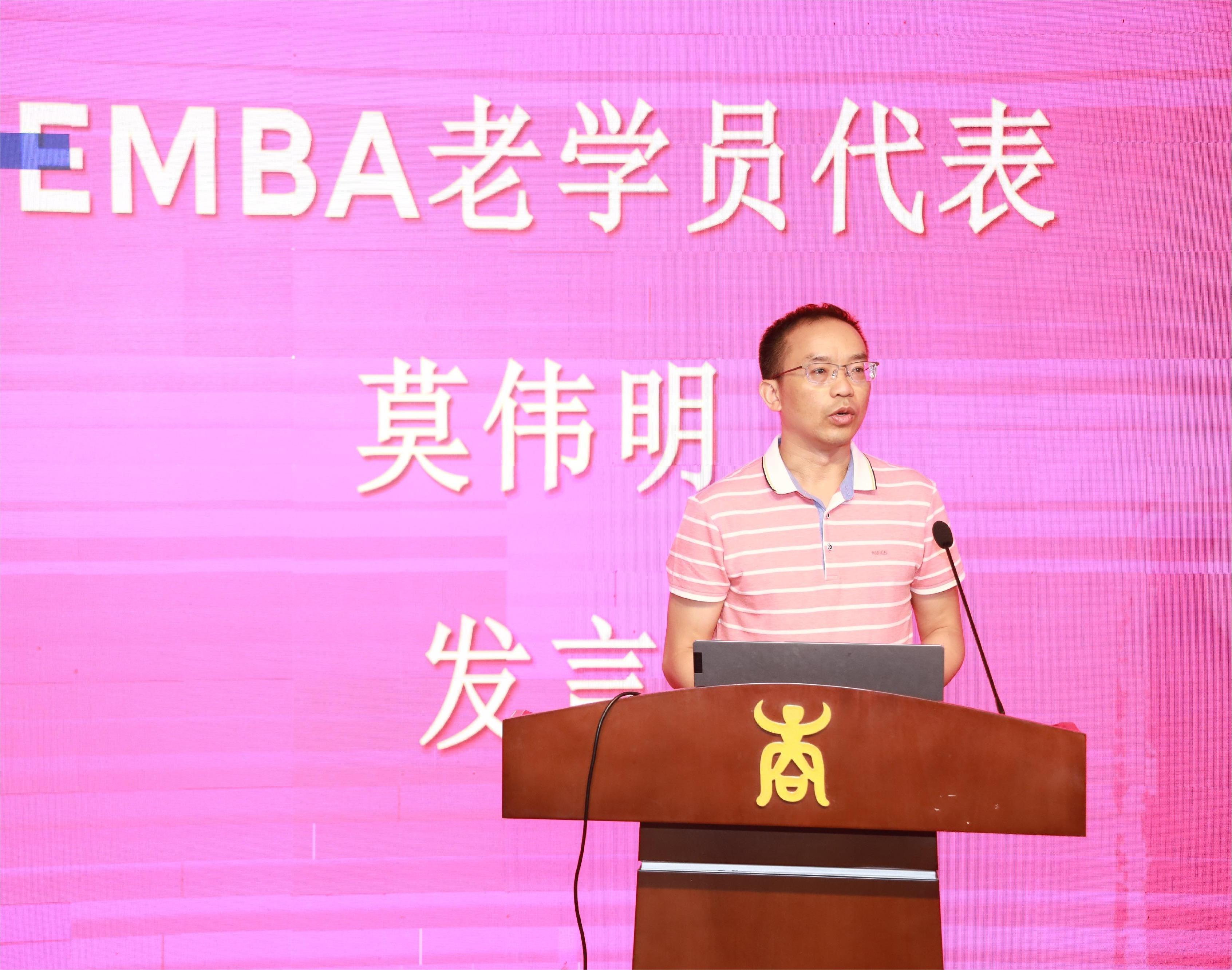 为同学们搭建了一个拓展思想深度、眼界高度、胸怀宽度、学养厚度、人脉广度的好平台;感谢EMBA教育中心老师们对同学们的关爱;感谢为同学们传道授业解惑的各位优秀老师。其次,他就过去一年的生活感悟、学习感触与新生们分享,希望新生们珍惜校园生活。最后,他衷心祝福学弟学妹们学有所成,如期毕业。