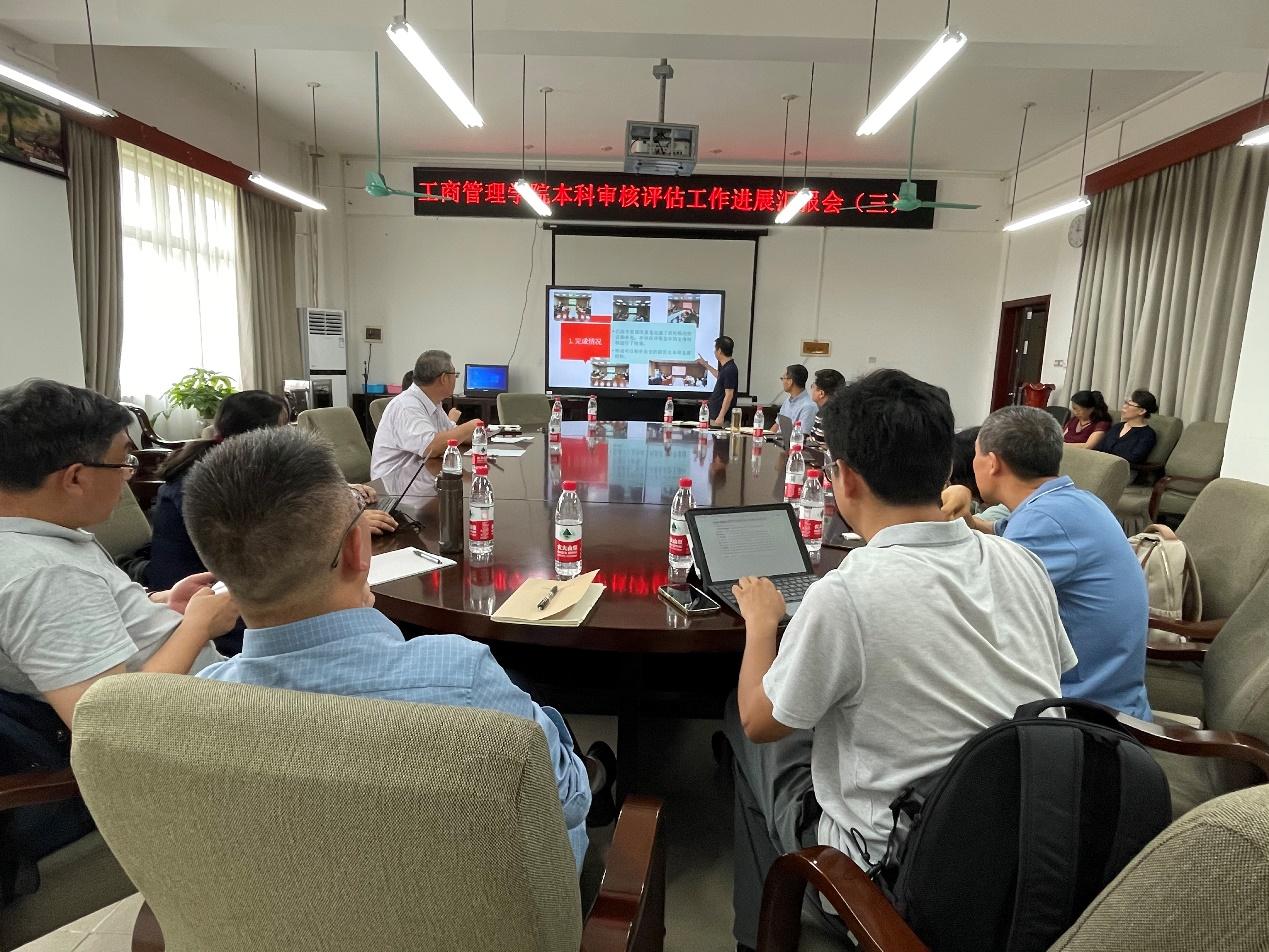 在学院420会议室召开本科教育教学审核评估工作汇报会第三次会议。会议由院长朱帮助主持,院党委副书记黄晋、副院长申韬,以及各系、各部门负责人参会。