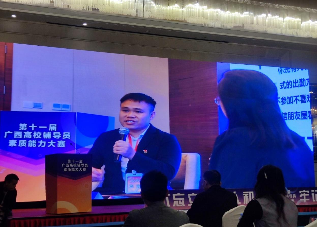 辅导员岑汉成老师以总分第四名获得大赛一等奖,并在“基础知识”、“谈心谈话”两个比赛环节中获“最佳表现奖”。