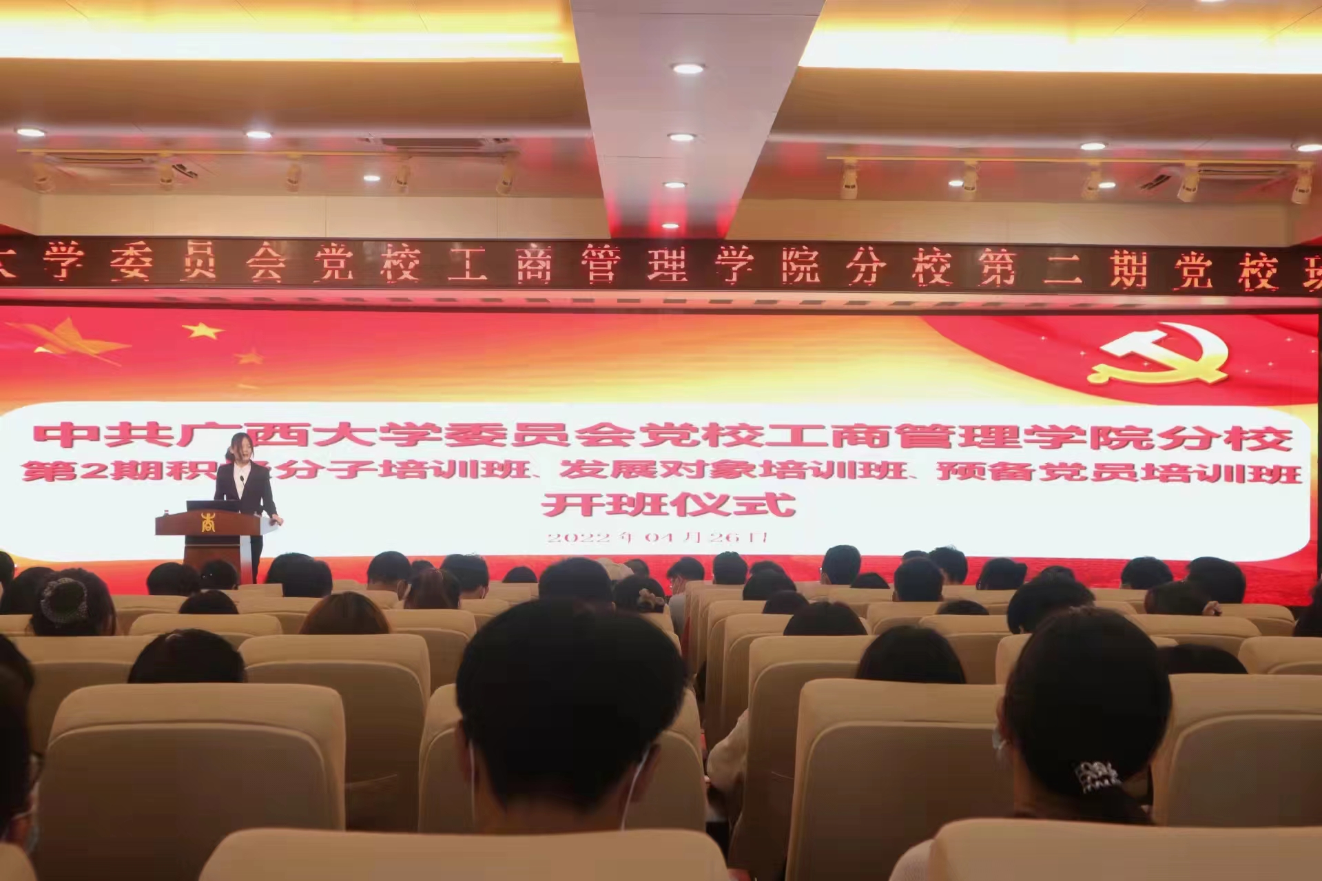 分党校第二期党校班开班仪式在128报告厅隆重举行。学院党委书记罗诚、党委副书记黄晋,专职组织员黄照温、团委书记马丽娟、团委副书记岑汉成、辅导员冯莎莎,以及来自入党积极分子党校班、发展对象党校班和预备党员党校班的学员代表共同参加了开班仪式。