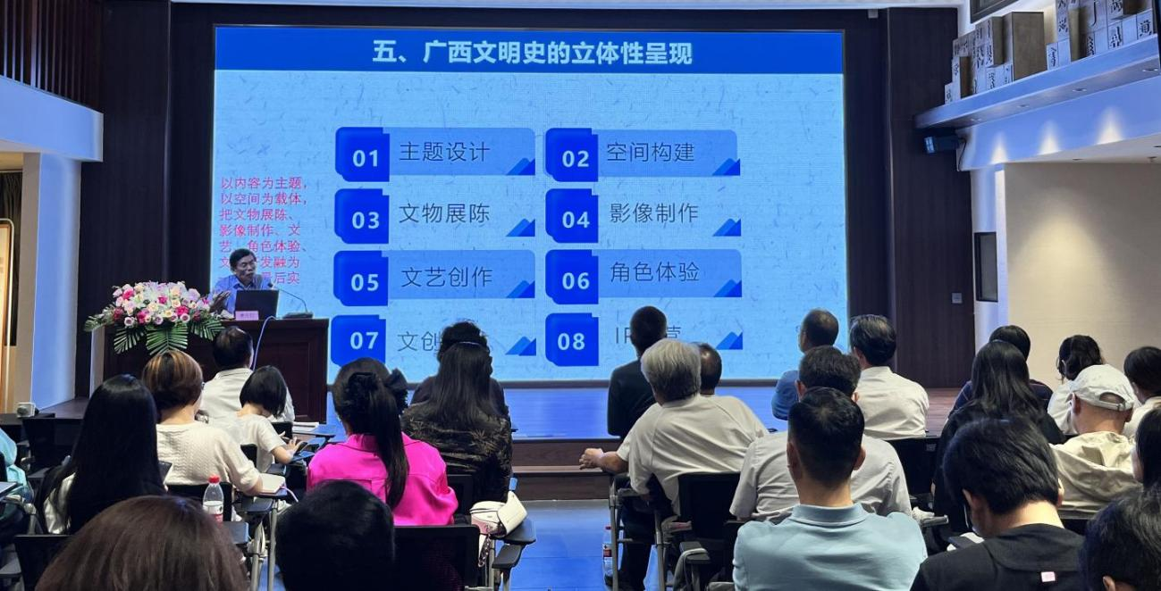 讲座中,曹光哲教授从文明史的角度,阐述了广西正面临的两个历史性命题:一是学习贯彻习近平总书记关于广西工作论述的重要要求,以铸牢中华民族共同体意识为主线,奋力谱写中国式现代化广西篇章;二是学习贯彻习近平文化思想,努力建设中华民族现代文明。他指出,铸牢中华民族共同体意识视野下的广西文明史,就是把统一的多民族国家中的广西、多元一体的中华文明中的广西两者结合起来。随后,曹光哲教授从广西文明史的整体性思考、广西文明史的标志性事件、广西文明史的代表性人物、广西文明史的标识性元素、广西文明史的立体性呈现等5个方面,对广西文明史进行了探讨。