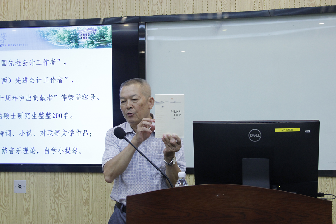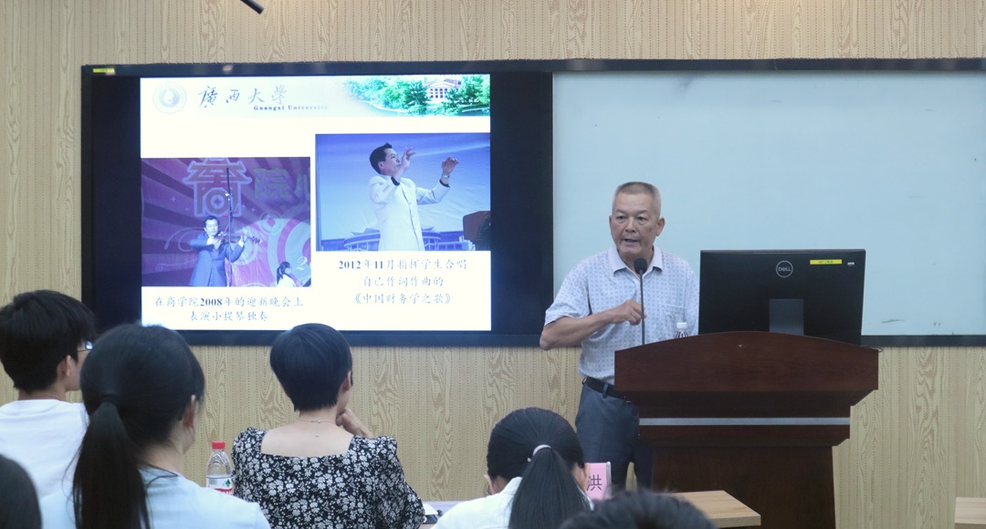 农学院和商学院辛勤耕耘的辉煌历程。他的分享不仅让在座的同学们仿佛穿越时空,亲身感受那段艰苦奋斗却充满光辉的岁月,更展现了韦教授对党的忠诚和对教育事业的热爱。韦教授的人生之路并非坦途,他的成功背后是无数次的努力与坚持。他用自己的亲身经历告诉大家,对学习的渴望和对卓越的追求是支撑他不断前行的重要动力。在讲述过程中,韦教授还特别强调了青年时期树立人生目标的重要性,并分享了诗歌及文学对他个人成长和树立人生目标的深远影响。