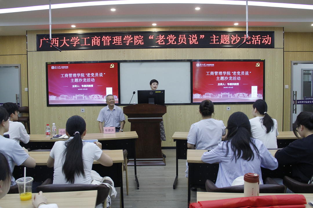 退休老教师韦德洪教授作为主讲嘉宾出席此次活动,学院团委书记马丽娟、院团委副书记郁文丹以及学生党员代表们共同参加活动。