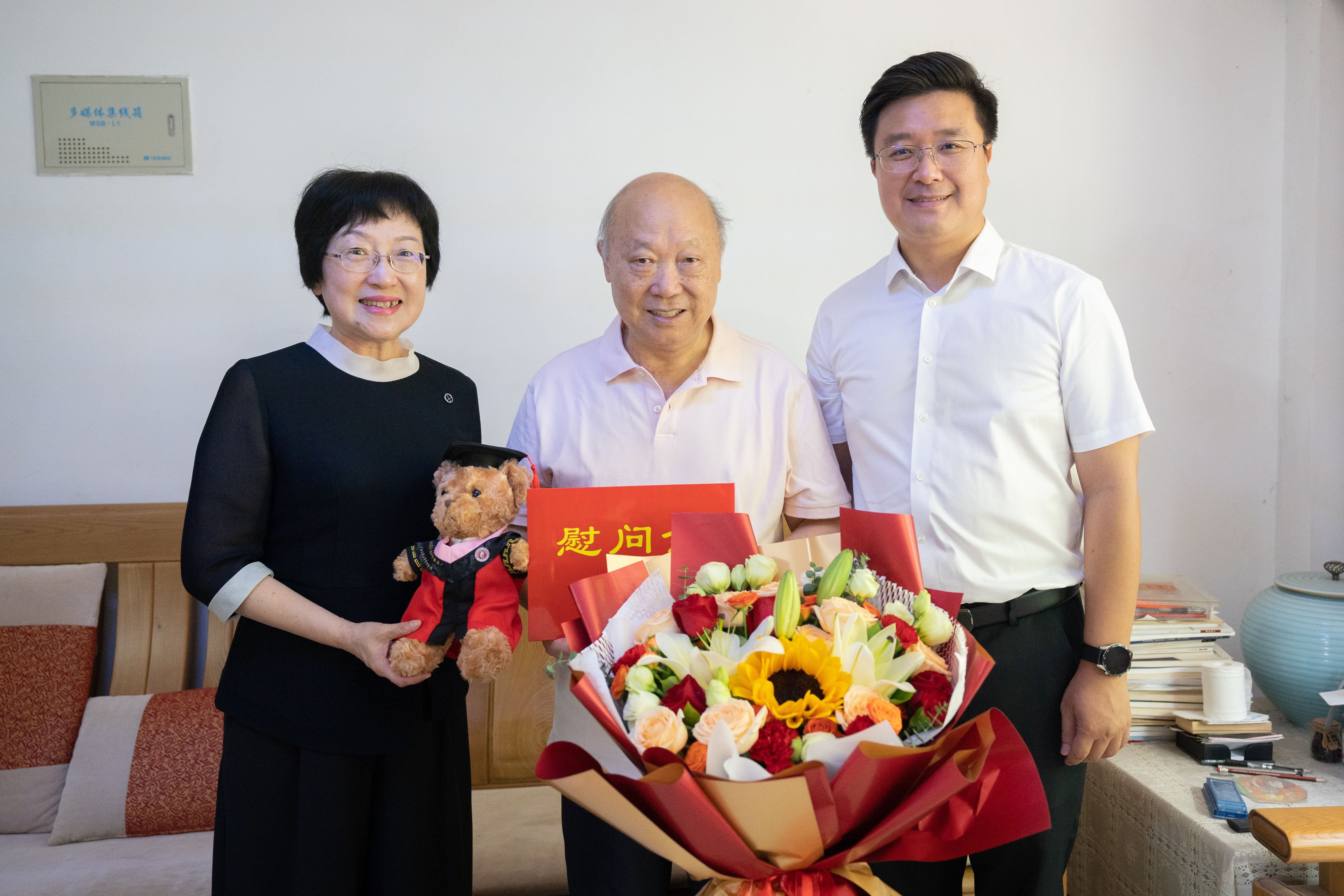 学院领导向阳国亮老师(中)送上鲜花和慰问金