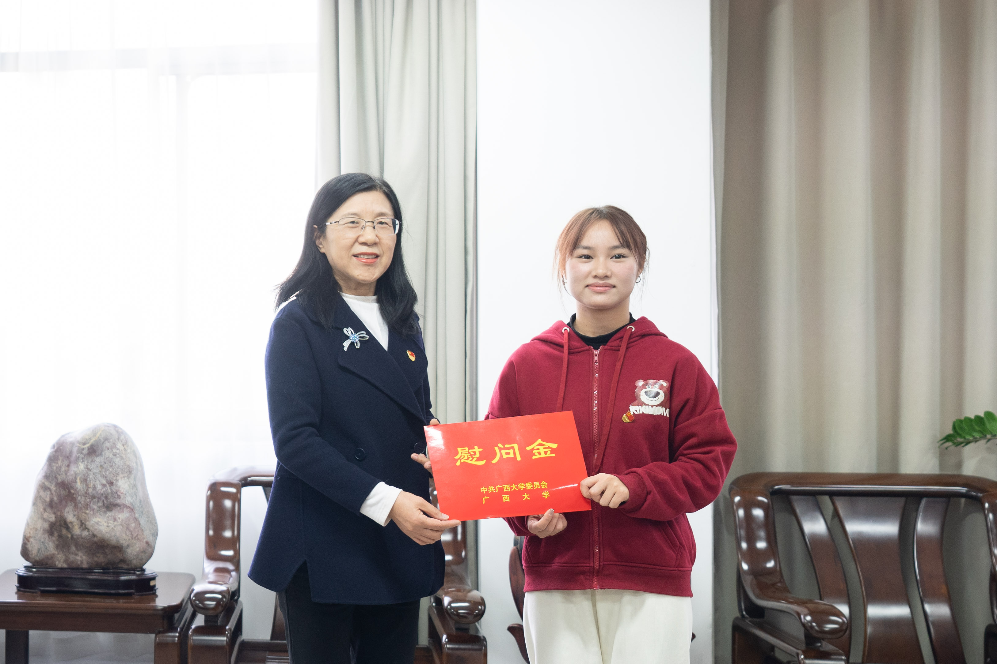 研究生党员代表韦尹洁,送上党组织的关怀和祝福。党办校办、组织部、学生工作部(处)负责人陪同慰问。学院党委书记黄晋、院长朱帮助、党委副书记肖克宁参加慰问。