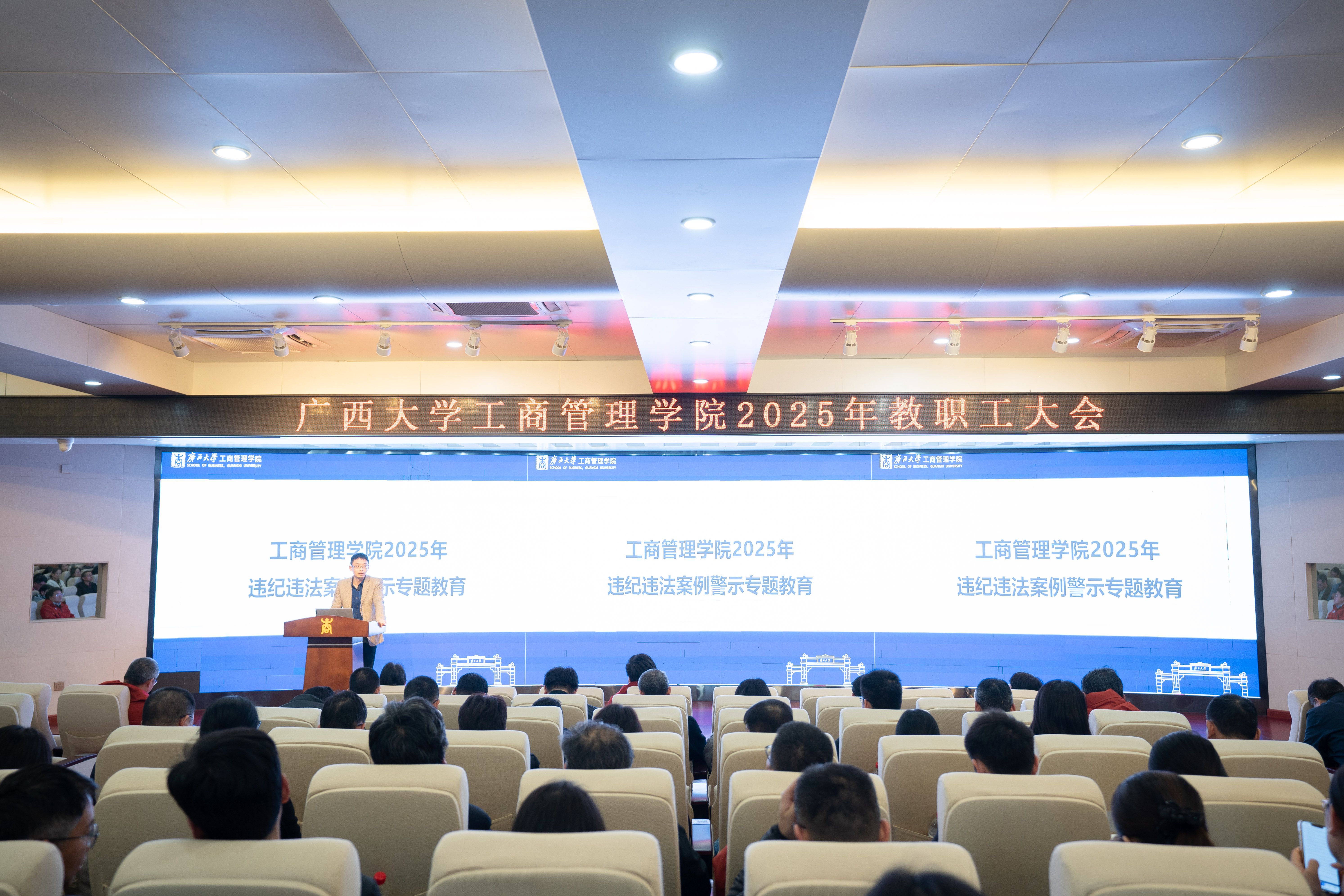 随后,肖克宁副书记、朱少英副院长、廖东红副院长,韦铁院长助理结合各自分管(代管)工作,就学生工作、工会工作、纪委工作、研究生管理、人事和行政管理、学科建设与科研管理等方面的工作亮点及成效、下一步工作计划等进行了总结汇报。肖克宁副书记还结合近年发生的严重违纪违法典型案例,对全院教职工开展了违法违纪案例警示专题教育,强调严格遵守、执行和维护党的纪律的重要性。