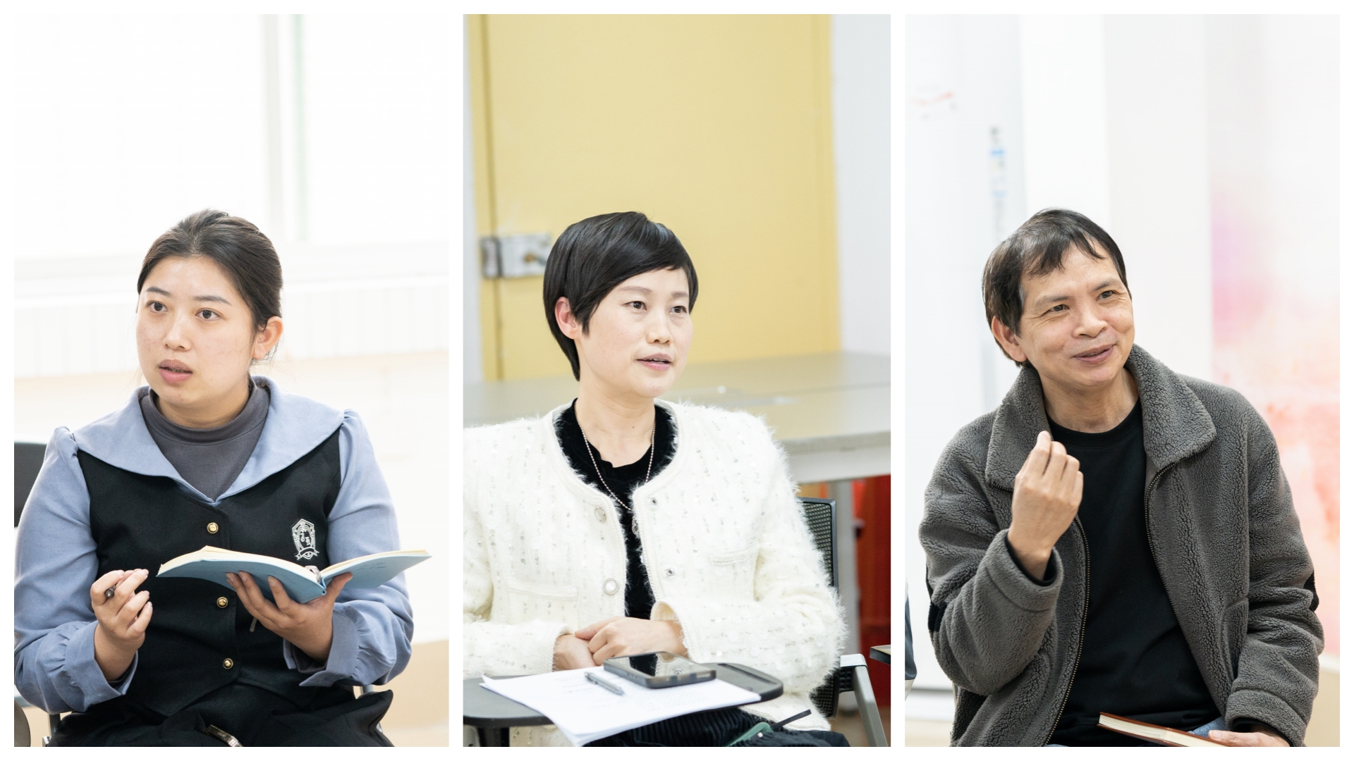 马丽娟老师(中)、黄照温老师(右)、郁文丹老师(左)与同学们交流