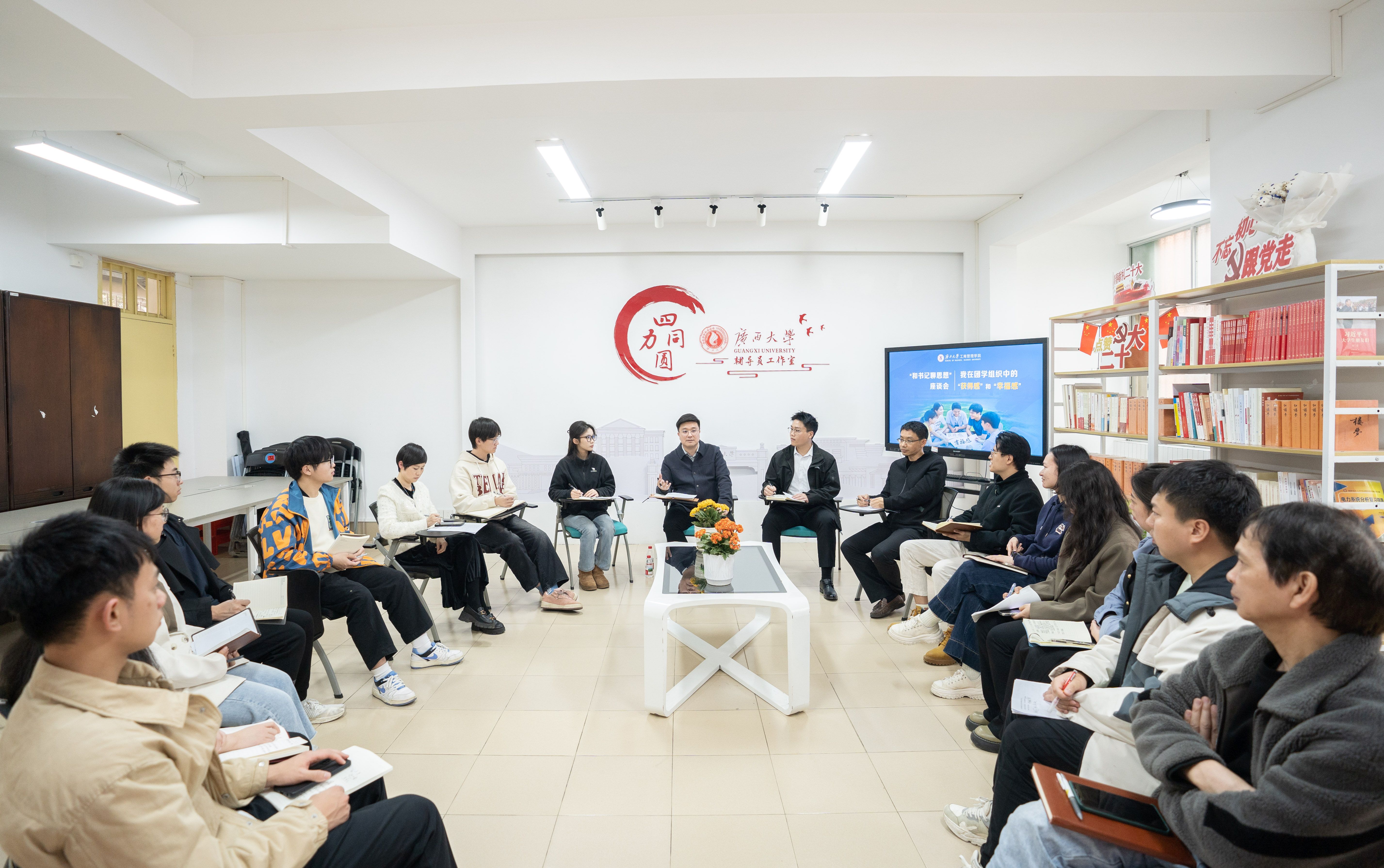 学生干部代表围坐一堂,畅谈团学组织中的“获得感”和“幸福感”。学院党委副书记肖克宁参加座谈会。