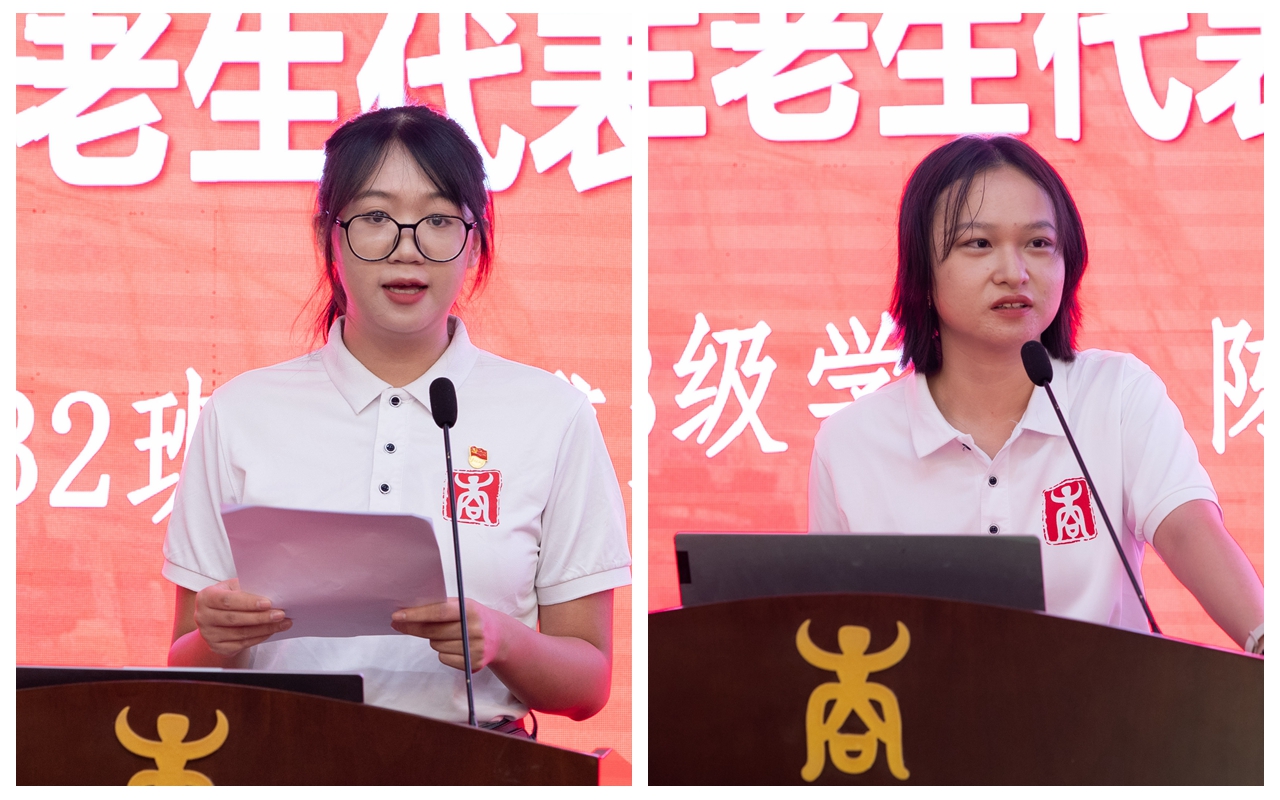 会计学232班秦博轩、2023级工商管理学硕陈星伶代表老生发言。秦博轩鼓励新生们要认识自己,做好规划;坚持学习,勇于创新;参与实践,创造价值。陈星伶建议新生们保持好奇心和探索精神,以良好的心态、持之以恒的毅力与耐心面对学术挑战。