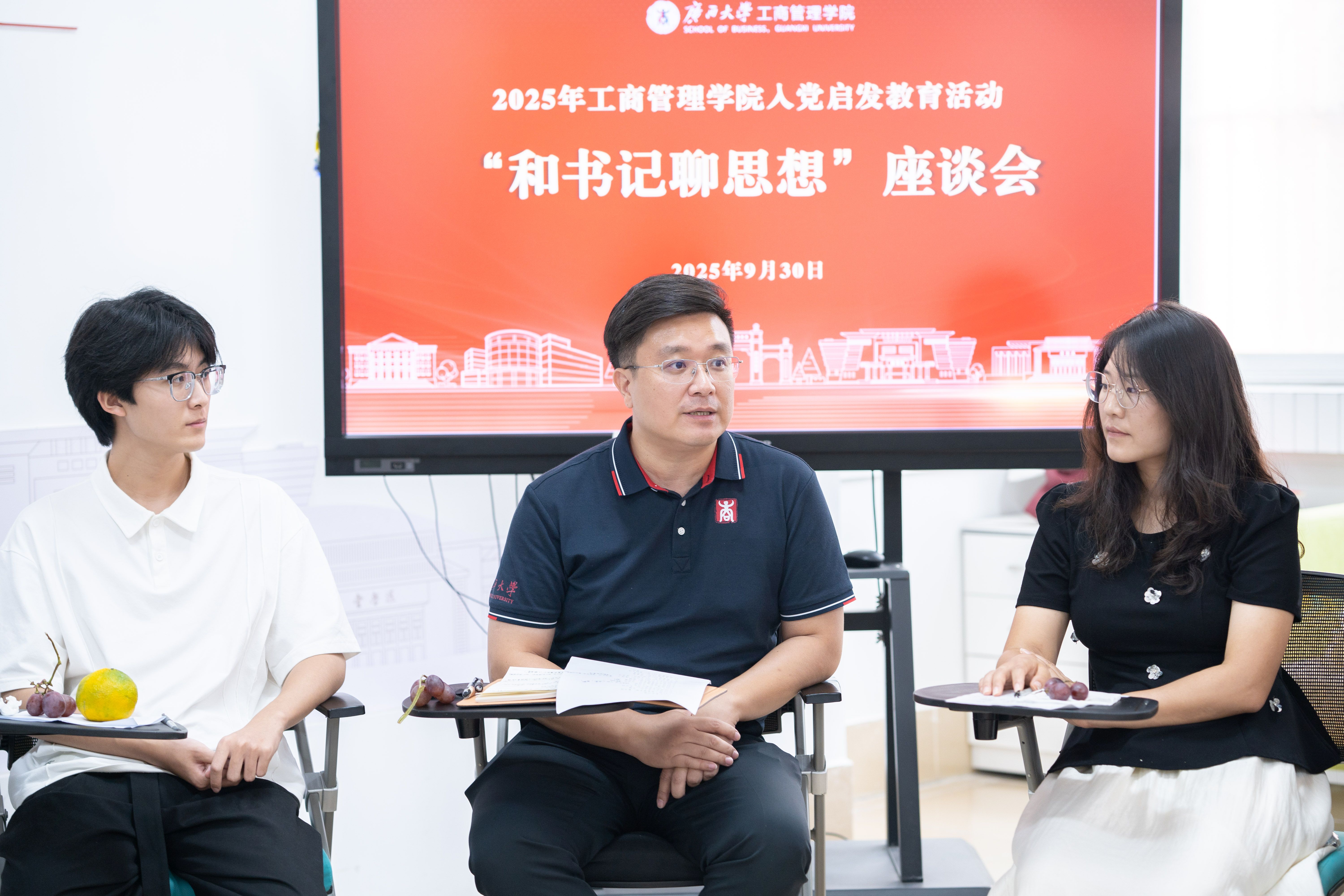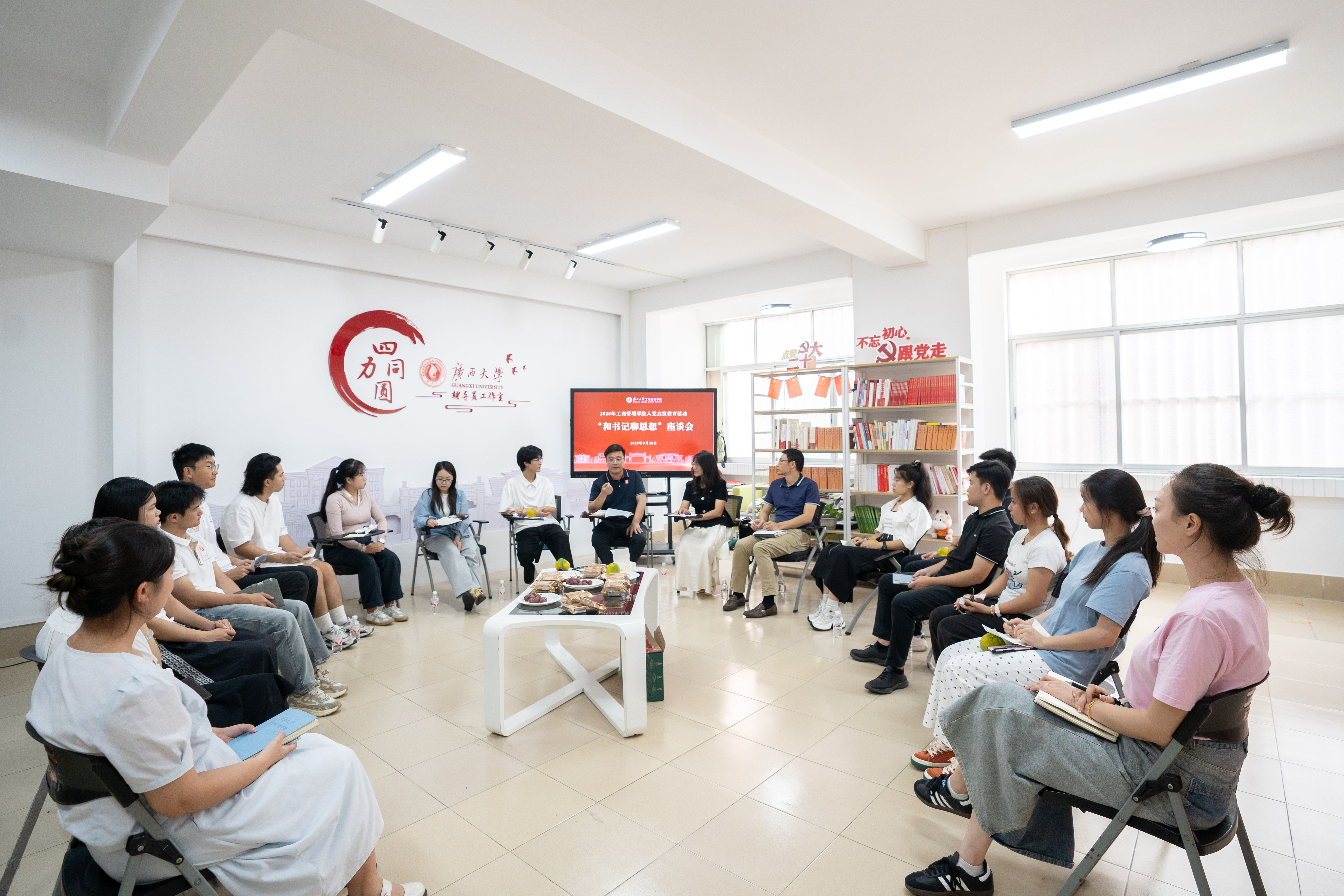 在西校园6B学生宿舍一楼(“四力同圆”辅导员工作室)举行新生代表“和书记聊思想”座谈会,学院党委书记黄晋与10名来自2025级博士、硕士研究生和本科生新生代表面对面交流,倾听同学们入学以来的学习生活情况以及对未来学业生涯发展规划,并向大家送上节日祝福。学院党委副书记肖克宁,辅导员马丽娟、郁文丹、管雅娣以及3名老生代表参加座谈会。