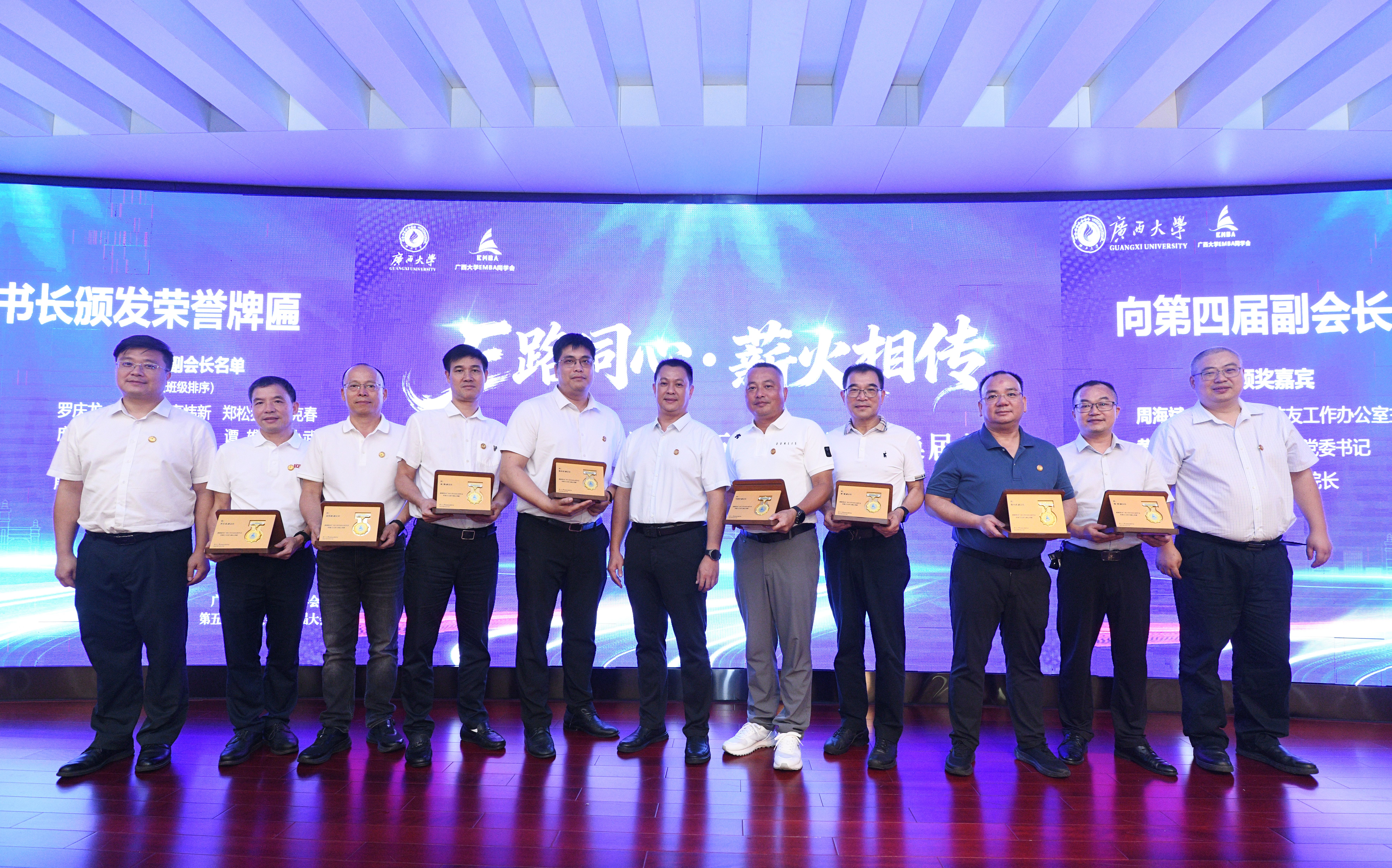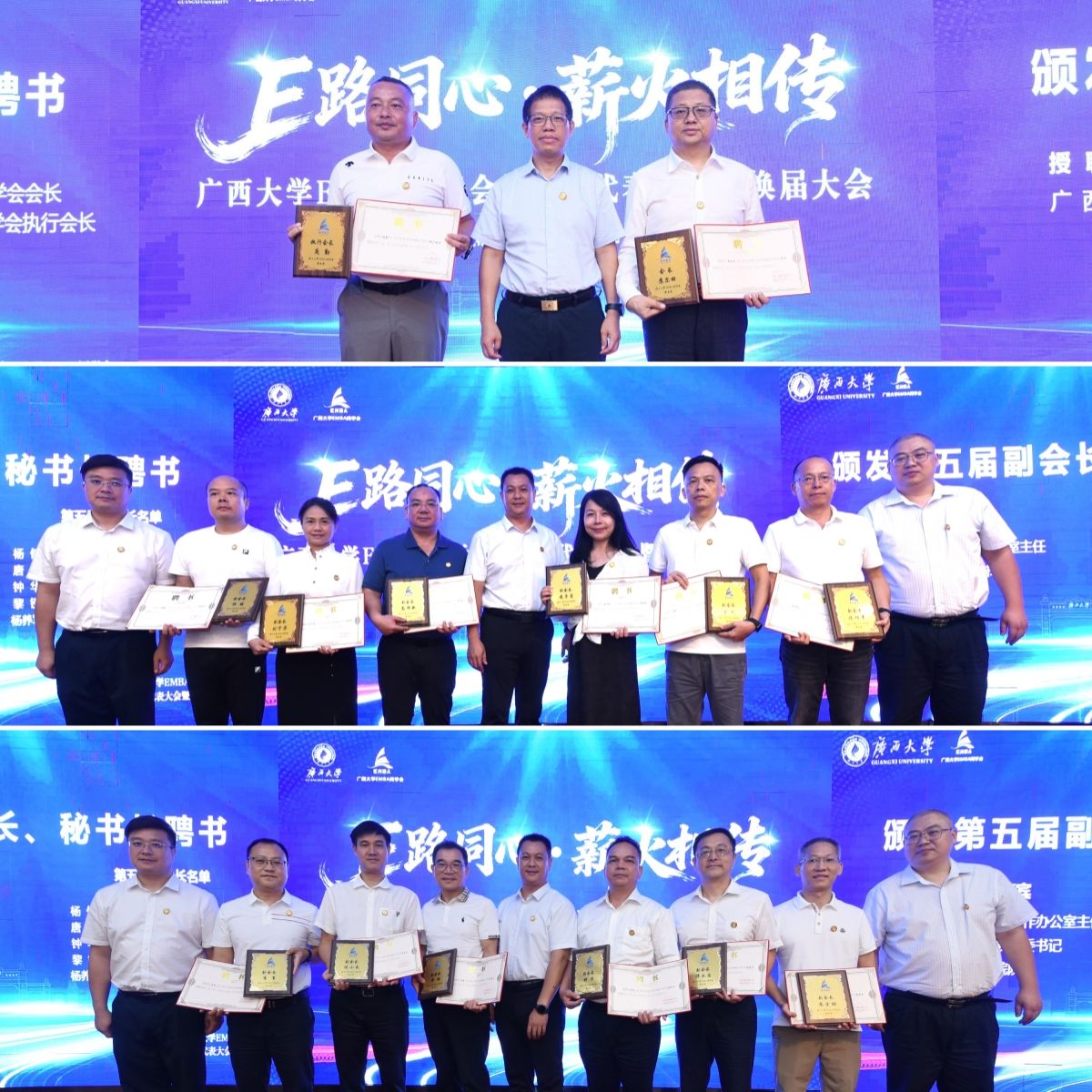 EMBA同学会第五届组织机构成员建议名单》。校友苏尔田当选为新一届会长,庞勤、陈轲当选为新一届执行会长和秘书长。出席大会代表、嘉宾共同见证了会旗交接仪式。宁旭初等为第四第五届组织机构成员分别颁发荣誉牌匾和聘书。