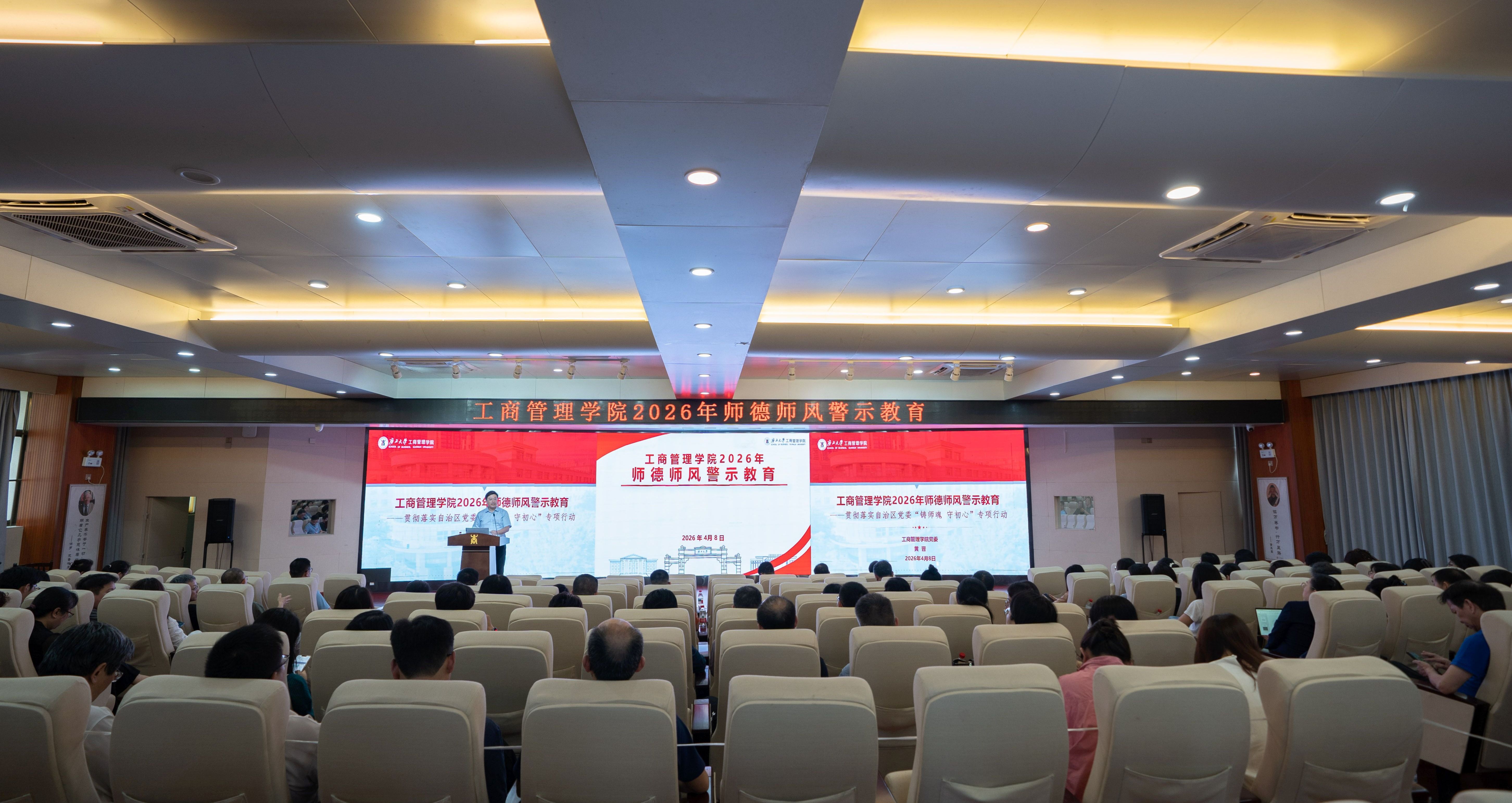 4月8日下午,学院在128报告厅开展2026年师德师风专题警示教育,由学院党委书记黄晋主持,全院教职工参加。