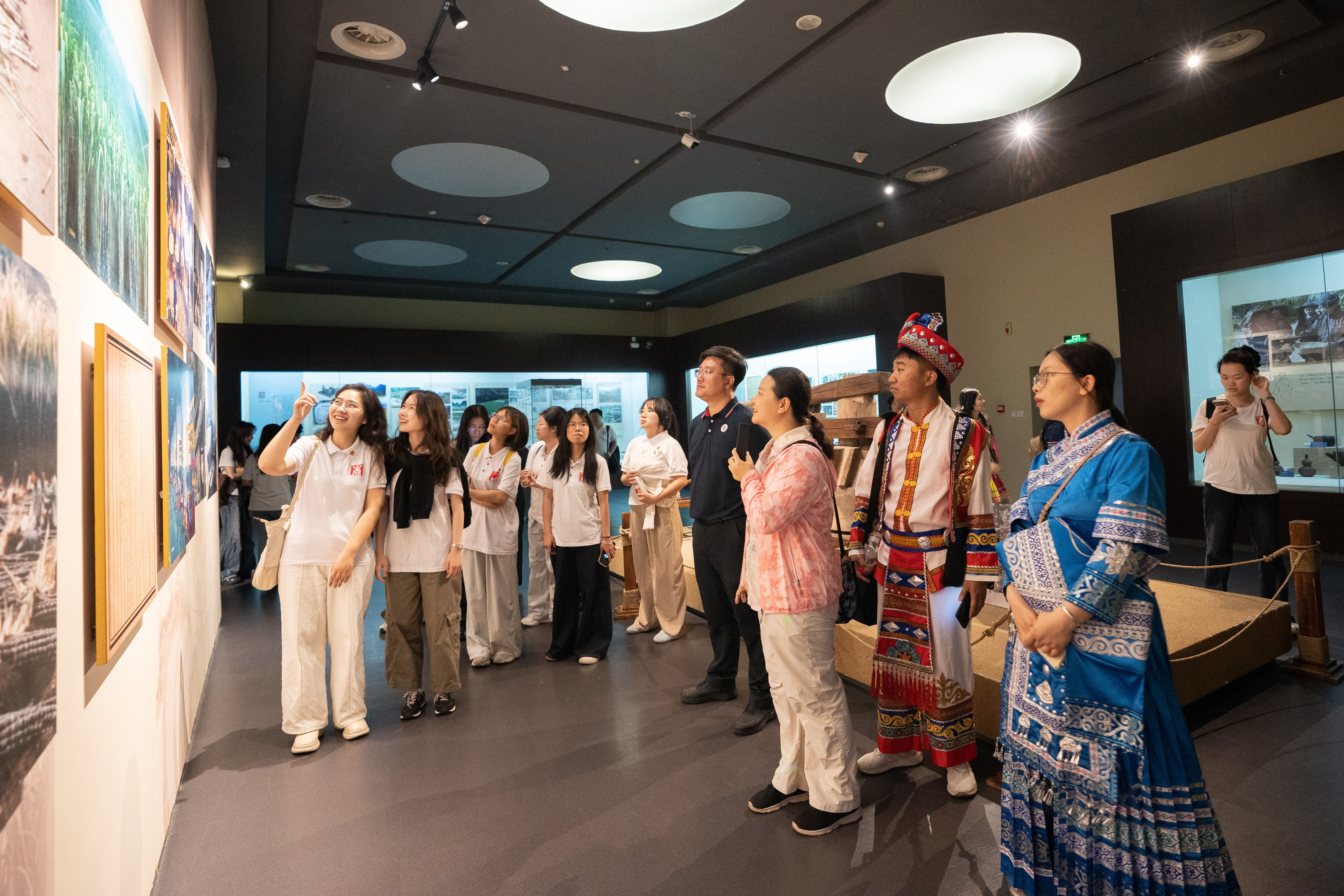 座谈交流会前,师生们走进广西民族博物馆,依次参观了花山岩画展区、铜鼓文化展厅、霓裳羽衣展厅等主题陈列。一幅幅古老的岩画、一面面镌刻历史的铜鼓、一件件绚丽多彩的民族服饰,生动再现了广西12个世居民族在八桂大地上交往交流、共生共荣的悠长画卷。同学们认真聆听、不时驻足,在厚重的历史积淀与鲜活的民族文化中,深刻感悟中华民族多元一体、血脉相连的精神内核。
