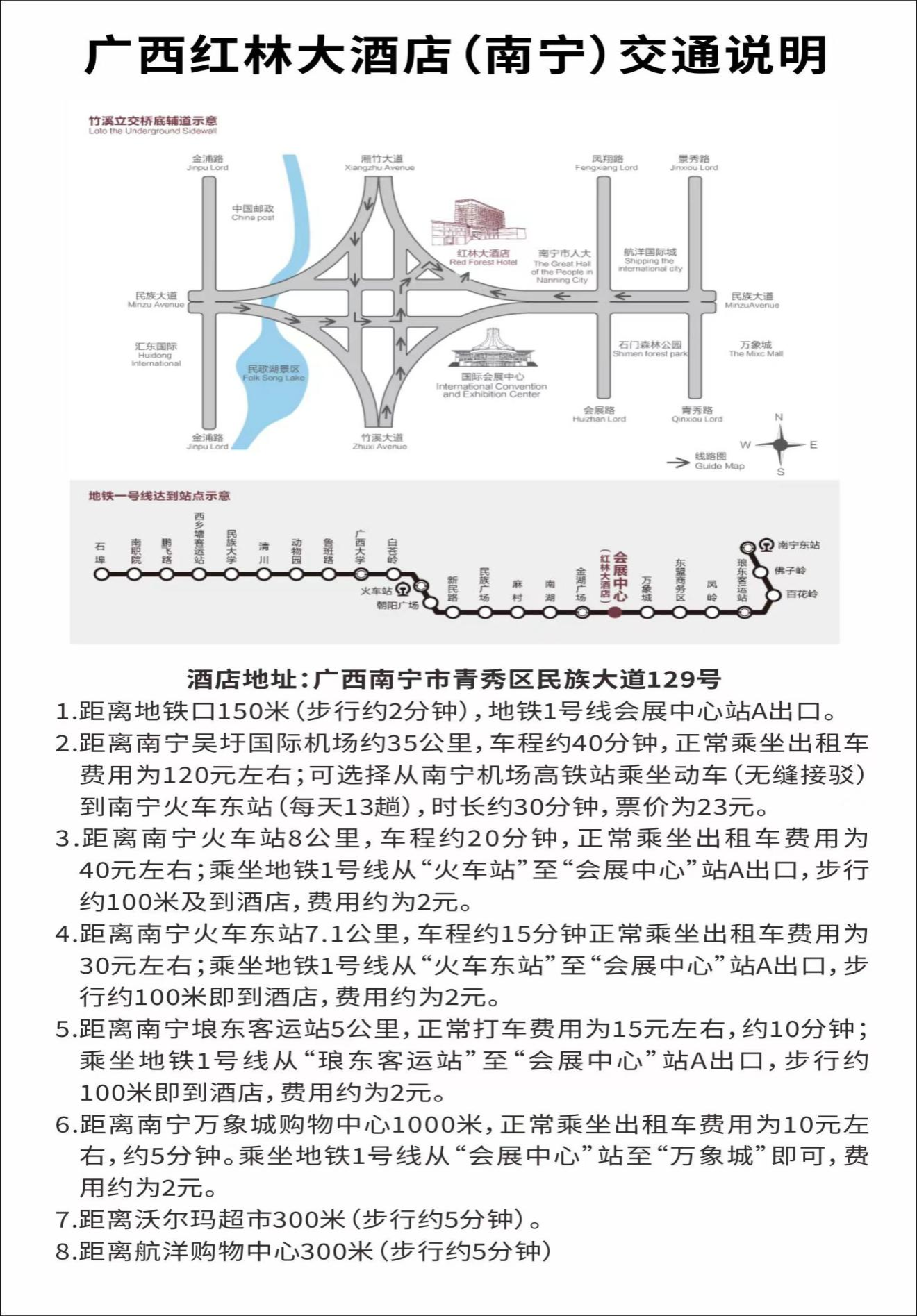 (2️)南宁火车站下-可坐地铁1号线(火车站A口上车到南湖站B2口下车,约20分钟,然后步行600米);从火车站到酒店打车约20分钟。