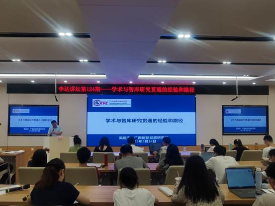 梁运文教授围绕着“学术与智库研究贯通的经验和路径”这一主题,分别从“构建中国特色新型智库体系”、“构建广西特色新型智库体系”、“服务西大教师智库研究平台”以及“学术与智库研究贯通的路径”四个方面展开讲述。