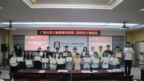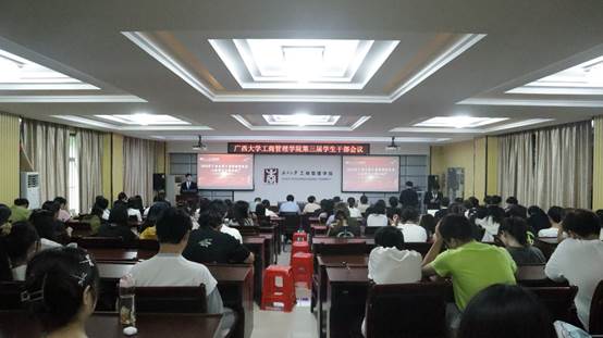 于学院124教室,召开第三届全体学生干部会议。院党委副书记黄晋、院团委书记马丽娟、院团委副书记岑汉成、院学生辅导员莫秀德、郁文丹出席本次会议。