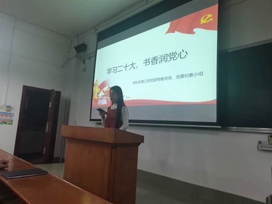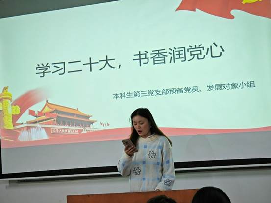 2023年11月17日,第五期预备党员党校班研究生第三党支部学员在学院429教室开展了“时常温书卷,习语暖人心”读书分享会。