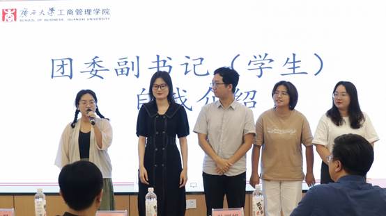 第二届研究生团学组织第一次全体委员会在122教室召开,2023级新生成员集体亮相。院党委副书记黄晋、院团委书记马丽娟、院团委副书记岑汉成、学工组辅导员张艳红、王乐、郁文丹出席本次会议。