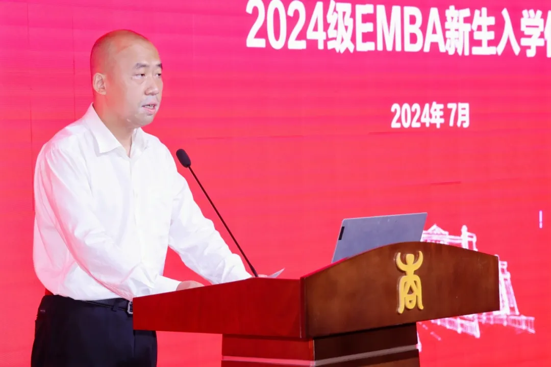 的关怀和指导表示衷心的感谢。朱帮助院长向新生们简要介绍了学院的基本情况,在同学们即将开启EMBA学习之际,他提出三点期望,一是持续学习,开放创新;二是跨界融合,拓宽视野;三是责任担当,贡献社会,并祝愿同学们能够登高望远,不惧挑战,学有所成、学有所获。