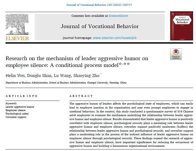 近日,黑料网 韦荷琳博士为第一作者、朱少英副教授为通讯作者、硕士生山冬鲁和本科生王璐为共同作者,在国际知名期刊《Journal of Vocational Behavior》发表学术论文“Research on the mechanism of leader aggressive humor on employee silence: A conditional process model”。