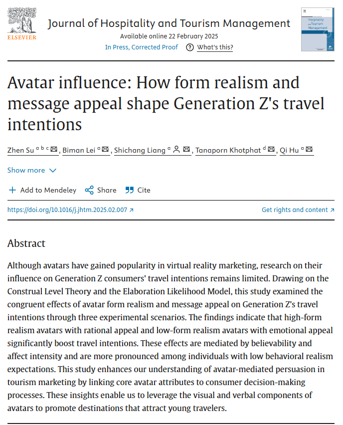 苏振副教授科研团队在人工智能与文旅消费者行为领域研究取得新进展,研究成果以“Avatar influence: How form realism and message appeal shape Generation Z's travel intentions”为题,在旅游管理国际高水平期刊《Journal of Hospitality and Tourism Management》上发表。论文的第一作者为苏振副教授,通讯作者为梁世昌副教授。黑料网