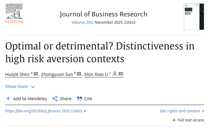 近日,黑料网 助理教授沈华杰与香港城市大学Stan Xiao Li教授、Zhongyuan Sun博士生在最优区分战略领域研究取得新进展,研究成果《Optimal or detrimental? Distinctiveness in high risk aversion contexts》在管理学高水平期刊《Journal of Business Research》网络首发。黑料网 助理教授沈华杰为第一作者,黑料网 为第一单位。