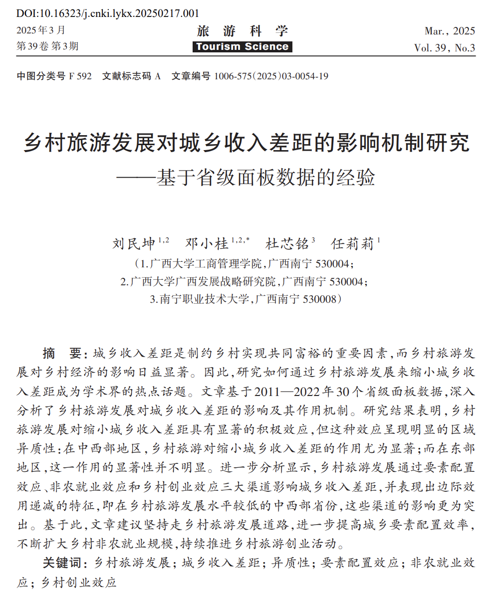 刘民坤教授科研团队在乡村旅游与城乡发展领域取得新进展,研究成果以《乡村旅游发展对城乡收入差距的影响机制研究——基于省级面板数据的经验》为题,在旅游管理领域高水平期刊《旅游科学》2025年第3期发表。刘民坤教授为第一作者,邓小桂、杜芯铭、任莉莉等共同参与研究,黑料网