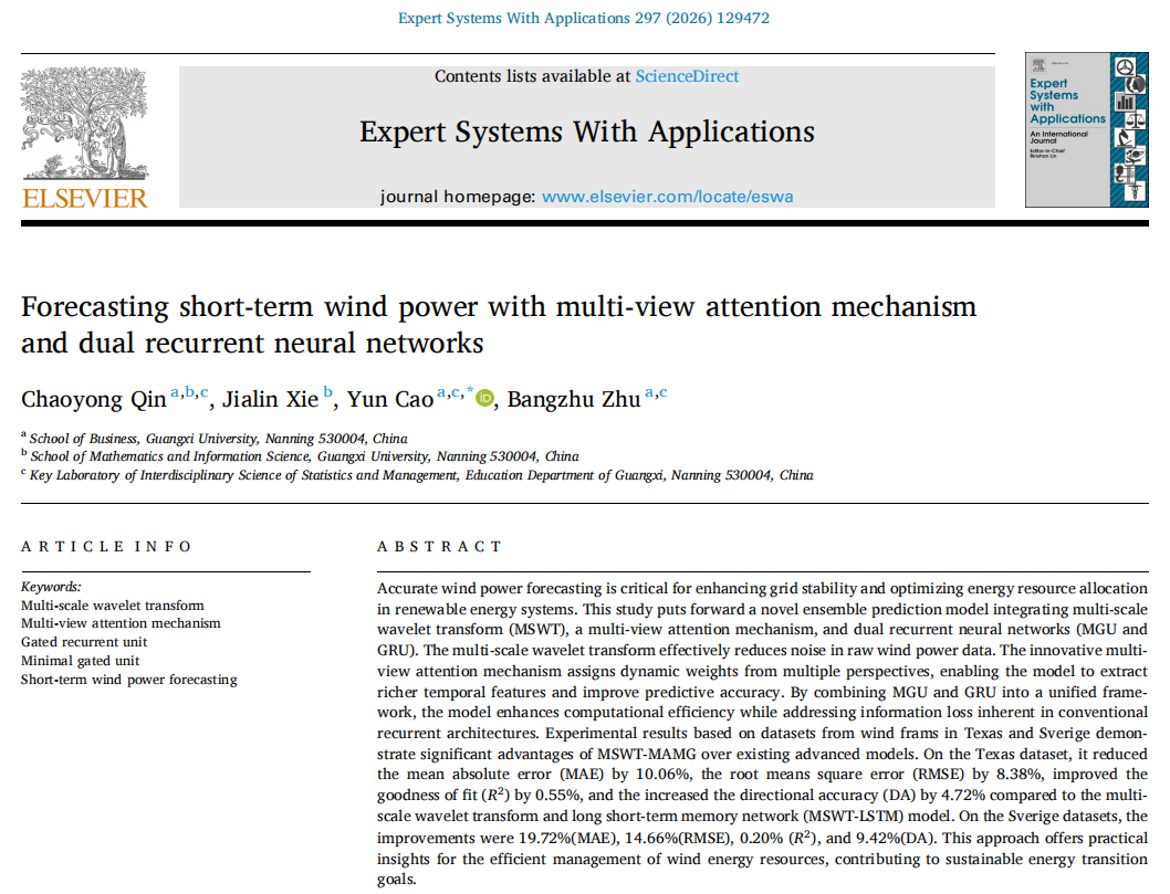 覃朝勇教授团队在能源预测领域研究取得重要进展,研究成果《Forecasting short-term wind power with multi-view attention mechanism and dual recurrent neural networks》在人工智能与能源智能应用领域国际权威期刊《Expert Systems With Applications》上发表,黑料网