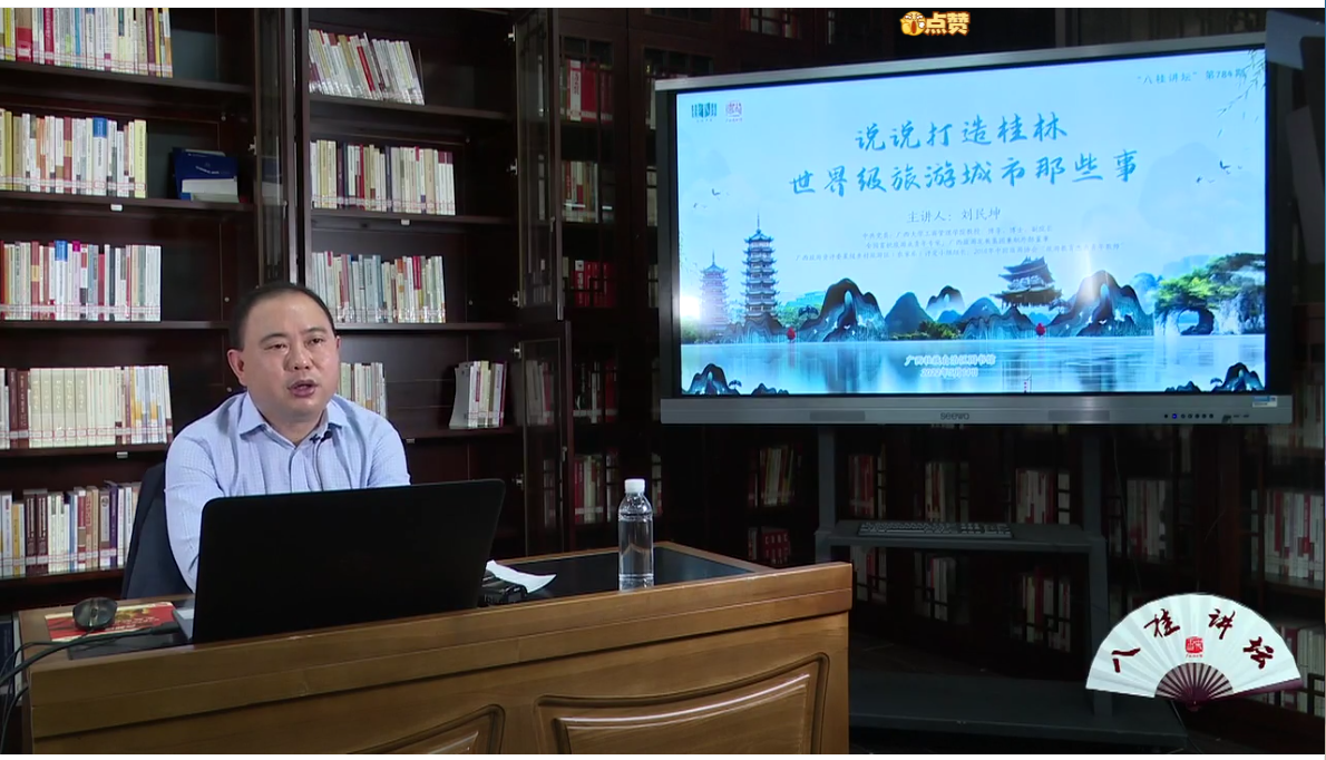 刘民坤教授应邀做客广西壮族自治区图书馆“八桂讲坛”,以“说说打造桂林世界级旅游城市那些事”为题进行了学术分享。“八桂讲坛”是广西壮族自治区图书馆为广大读书爱好者打造的公益性讲坛,至今已经举办了700多期。受到疫情影响,本次讲坛以线上直播的方式进行。